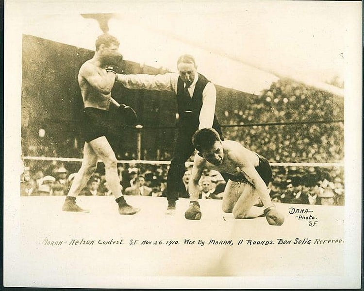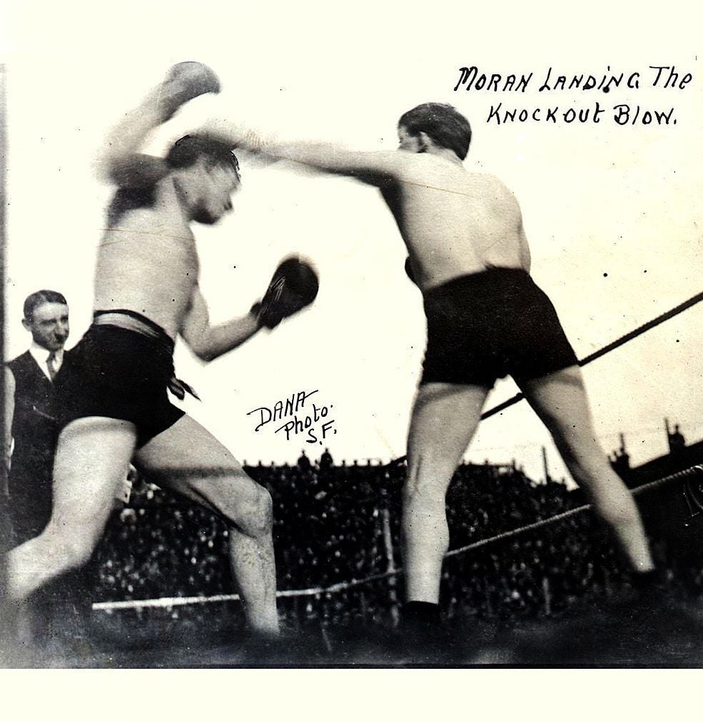 It was in that weight division, one of boxing’s most talent-laden, that Moran would make his indelible mark. On November 26, 1910, at Blot’s Arena in San Francisco, he did what no other man could ever do: knock out the great Durable Dane, Battling Nelson. Eddie Sterns had stopped the young Nelson and Ad Wolgast had butchered Bat to a standstill in their titanic engagement at Port Richmond. But nobody had put Nelson down for the count. It seemed that boxing would never see that particular curtain fall.