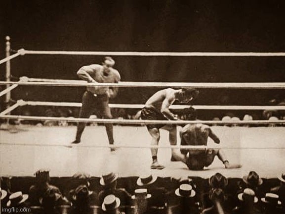 In the first round, after Firpo had gone down seven times, one of his long smashing rights caught Dempsey fairly and knocked him clear through the ropes. The champion's head disappeared over the edge of the ring, his white-clad legs shot up in the air, and it seemed a new world champion was about to enter into his glory. On the count of nine, Dempsey managed to stagger back into the ring with the help of newspapers reporters sitting ringside, but the end of the round found him obviously badly shaken, and staggering as he had never been staggered before.