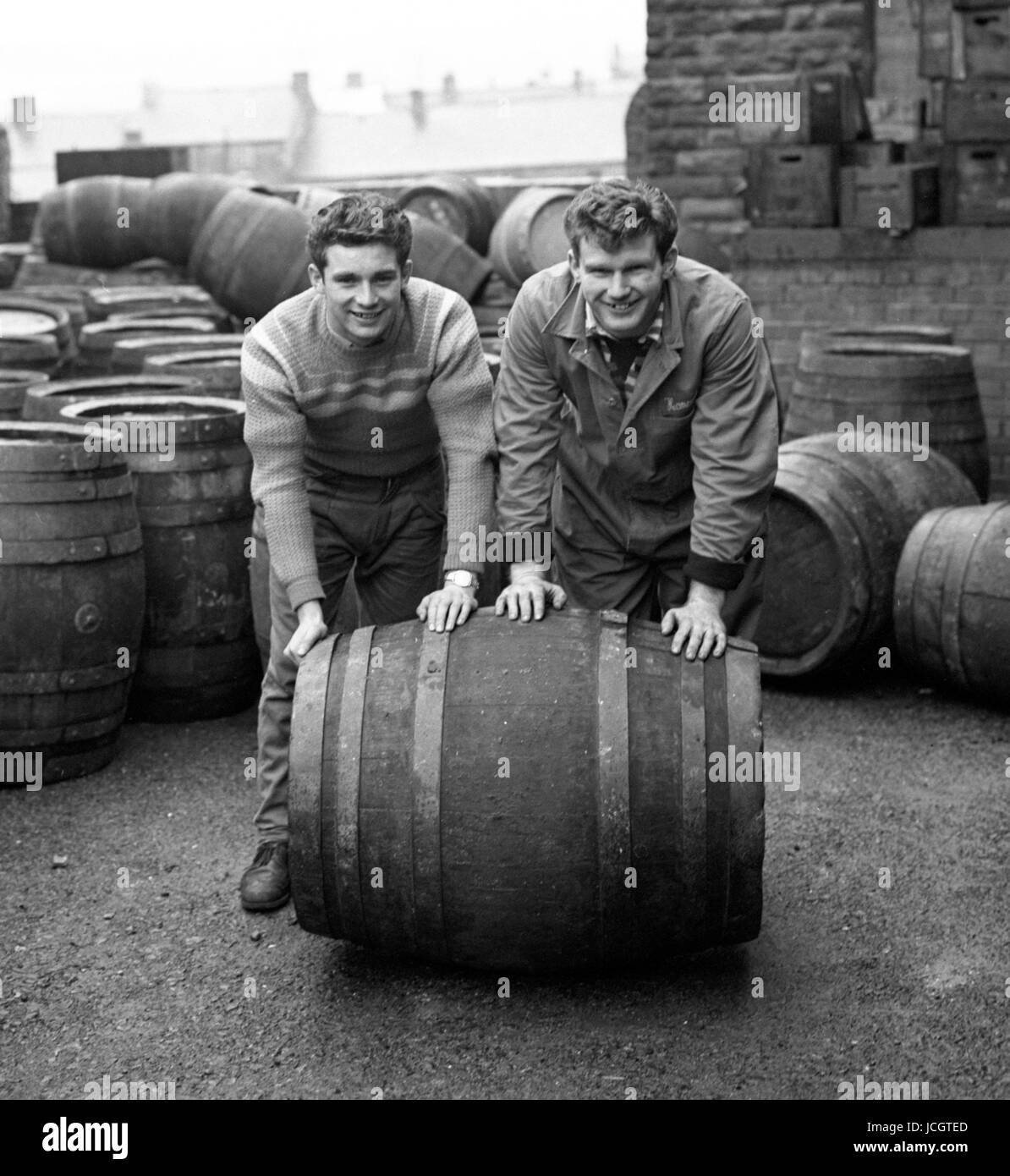 Howard Winstone (left) rolling a beer barrel at Merthyr Tydfil Brewery in South Wales, Winstone was employed there when he wasn't boxing.