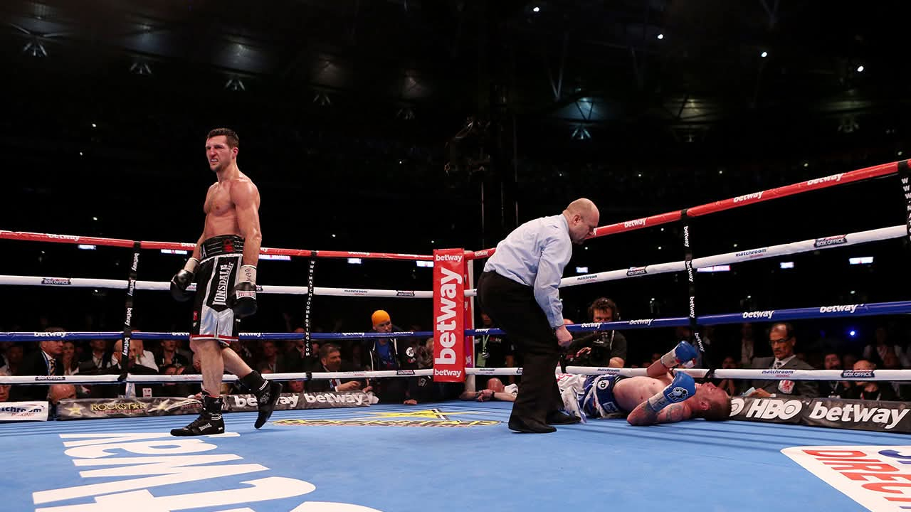 In round 7, Froch appeared to rock Groves. And in the 8th, Froch unloaded a sizzler of a right hand that flattened his rival. Grove went down awkwardly and his left leg got bent grotesquely to the side of his body, he stayed motionless, then the fight was waved off as Groves moved to get to his feet as it became clear it was over, but it was way too late.