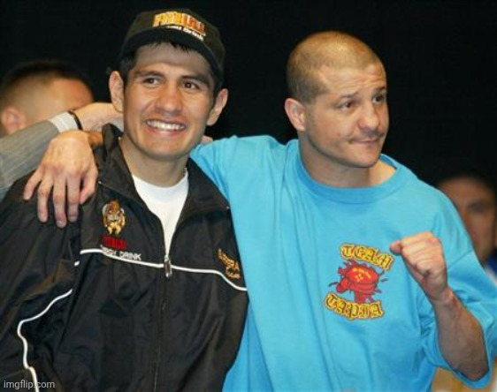 Let's get a few photos of Johnny Tapia in here. This is an image of Tapia with the legendary Mexican fighter Marco Antonio Barrera, aka "The Baby Faced Assassin", they were good friends and had a deep mutual respect for each other. They actually fought in 2002 with Barrera getting the decision victory. They respected each other so much that they had eachother's last names embroidered on their trunks when they fought, and after Tapia passed away Barrera always fought with Tapia's name on his trunks.
