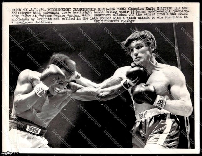 Ok, let's get some great shots from Emile Griffith's career in here. Look at that masterful jab, right in the face of Benvenuti.