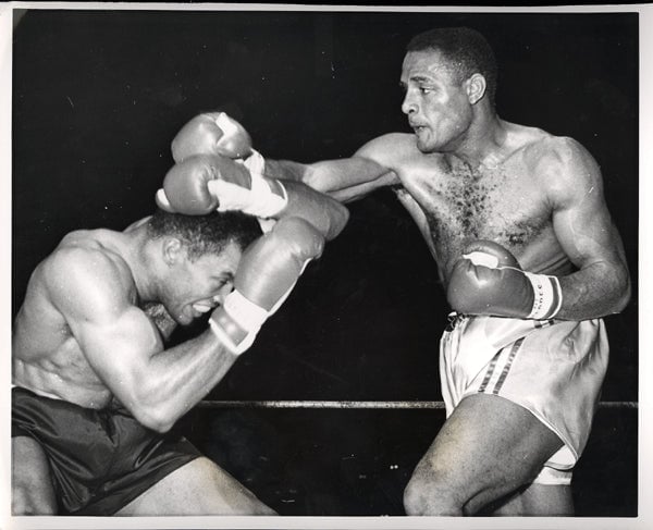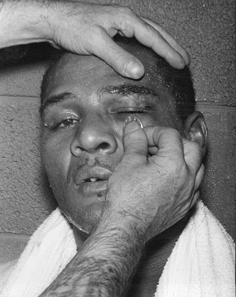 Trainer Petey Mack presses a half-dollar to the eye of Zora Folley to reduce swelling after a grueling 10-round battle with Doug Jones.