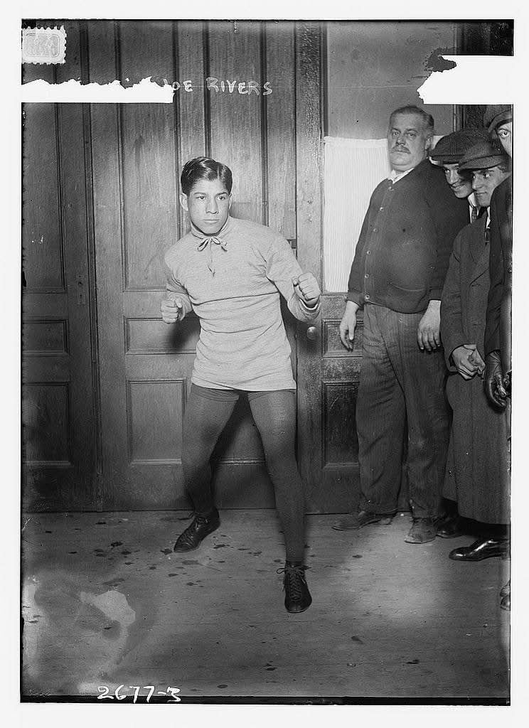 During his career from 1910 to 1923 they called him Mexican Joe Rivers, "The Lethal Latin." A Californian phenom, he burned his way through the bantamweight and lightweight ranks and was part of the notorious double-knockdown bout with Ad Wolgast, "The Michigan Wildcat", in which both men went down simultaneously but Wolgast was helped up by the ref while Rivers was counted out. Rumors had Rivers dying in WW1 on the SS Tuscania but in 1955 a sportswriter for the LA Times named Frank Finch heard about a Joe Rivers who had been hospitalized and recalled the name.