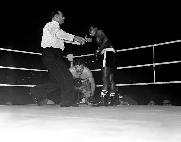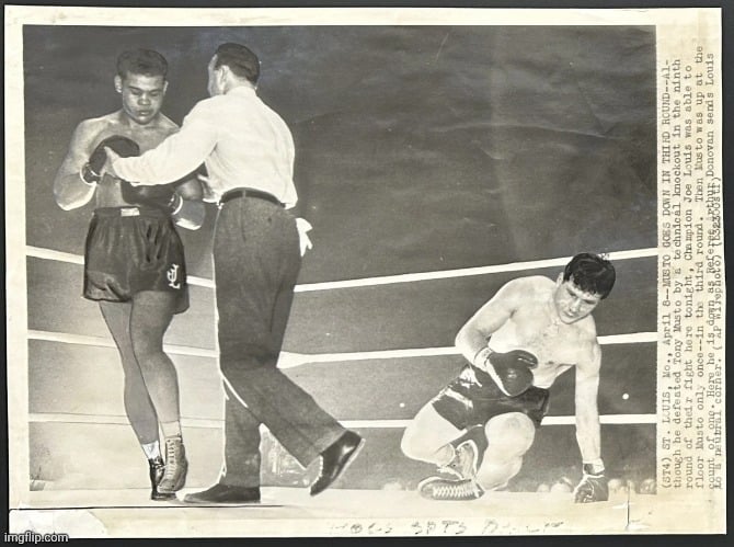 Joe Louis made the 16th successful defense of his world heavyweight title with a ninth-round stoppage of Blue island, Illinois' Tony Musto in Saint Louis, Missouri in 1941. Musto was still on his feet and still willing to fight when referee Arthur Mercante had seen enough after a methodical beating by the champion. Never before knocked down in thirty-nine fights, Musto found himself on the canvas in the third round. But the sturdy challenger bounced up and proceeded to present stubborn opposition to Louis. Musto's right eye required stitches when the fight was over.