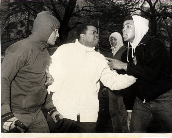 This is an interesting incident that took place right before Zora Folley and Muhammad Ali were about to fight in 1967. They were both out training, jogging in Central Park, and they just happened to encounter each other. Of course Ali being Ali just couldn't help himself but to start talking trash to Folley and a bit of a scuffle broke out. Drew "Bundini" Brown is pictured in the middle separating them, and Jimmy Ellis, a great fighter himself, is in the background looking on.