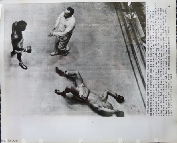 In the ninth round, Benvenuti dropped Griffith in a heap with a right. It was a hard, solid blow that hurt the defending champion. Emile quickly recovered, but at that point everyone knew his title was in serious jeopardy.