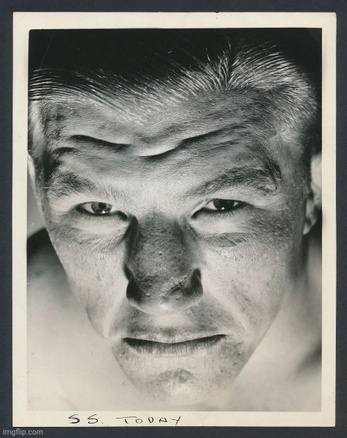 Tommy Farr was one tough son of a biscuit, he was forged in fire, he had these scars on his face and back, he got those scars because he worked in the coal mines in Tonypander Wales as a youth. The scars on his face, he got them when he was blown up in a coal mining accident, he was hit in the face with shrapnel, but he survived. He got the scars on his back from crawling through narrow, punishing tunnels down in the coal mines. He became a fighter because he wanted to get the hell out of coal mining, he saw boxing as the lesser of the two evils, and he once said, "After the mines, what is fighting? Fighting is child's play." He also wanted to become a fighter because he was used to fighting, he had to participate in street fights as a youth to help put bread on the table for his seven siblings, three brothers and four sisters, his mother passed away early in his life and he had to help support his family. His father was also a bare knuckle fighter and coal miner, his father was blown up in a coal mining accident as well, which eventually led to his death. Coal mining is a hard, dangerous profession. Farr had one of the most beautiful jabs in boxing history, he could put on a clinic in the art of jabbing, and like I said he was gutsy, tough as nails, and durable, he took on some of the most murderous punchers of his era and held his own with all of them, Max Baer, James Braddock, Lou Nova, and of course Joe Louis. Farr was the type of fighter that was always game, he brought it every time he stepped in the ring and if you were going to beat him, he made you earn it. Here's a photo of his face up close and you can see the shrapnel scars.