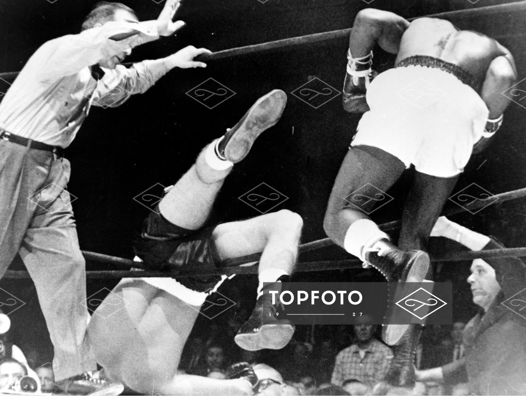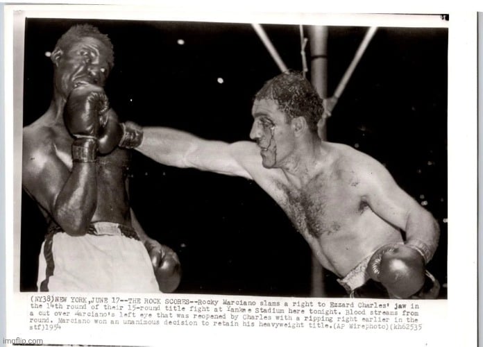 One of the most savage boxing photos ever taken, Rocky Marciano lands a brutal right hand that distorts the face of Ezzard Charles.
