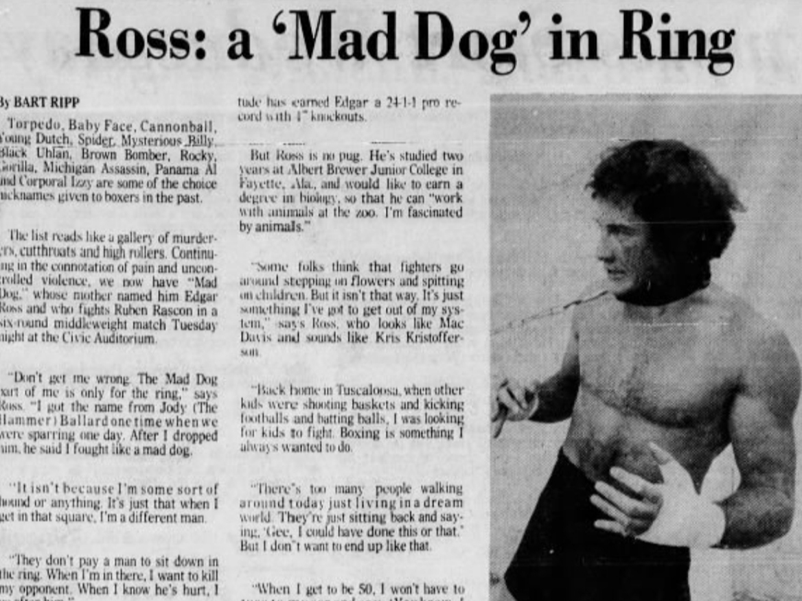 Edgar "Mad Dog" Ross, 1970s welterweight/middleweight with good power and an intense fighting style. Edgar Ross grew up in Tuscaloosa, Alabama, his brother Ronnie played football for Auburn, but Edgar was too violent for football, according to a childhood friend, and picked fights on the Tuscaloosa streets before turning to amateur boxing on the advice of a Tuscaloosa County deputy sheriff who, himself an amateur boxer, had seen Ross beat up on people in bars and parking lots. After two fights he joined the Navy and served in Vietnam, and after his return from Vietnam he returned to boxing, compiling a 24-4 record and winning the state's Golden Gloves competition. He turned pro in 1972, fighting his first nine fights out of Mobile and then joining the stable of Pete Ashlock in Orlando, Florida.