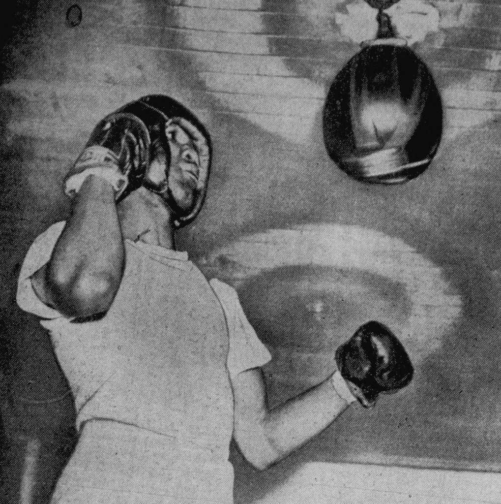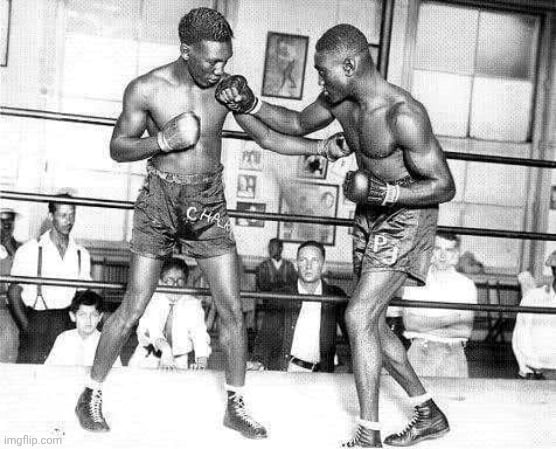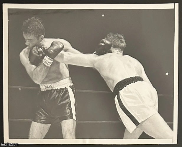 Here's a photo of Joey Maxim taking it flush on the chin from the murderous punching southpaw "Irish" Bob Murphy and just eating it like it's nothing. Maxim had a granite chin.