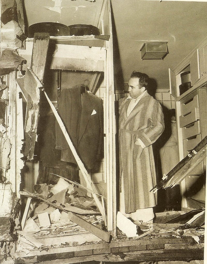 In real life, Albert "Chalky" Wright fought and KO'd Mickey Cohen in 1933. If you're not familiar with Mickey Cohen, he was a real-life Jewish mobster that worked for the notorious Bugsy Siegel in the 1930s and later took over the organized crime rackets in Los Angeles, he pretty much ran Los Angeles in the 1940s and 50s. Cohen was also a professional boxer early on in his life at one time. Cohen actually did time in Alcatraz, he had a nasty scar under his left eye, he lived a very violent life, he was notorious as hell. During his reign, Cohen faced many attempts on his life, Mickey Cohen and several companions were shot outside Sherry's Restaurant on Sunset Boulevard on July 20th, 1949, but Cohen survived. His home on posh Moreno Avenue in Brentwood was bombed on November 21st, 1949, but he survived that assassination attempt as well. The guy legit had more lives than a cat, they tried every thing in the book to kill him but never could get it done. The bottom photo is Cohen's home after the bombing, with him standing inside surveying the damage.
