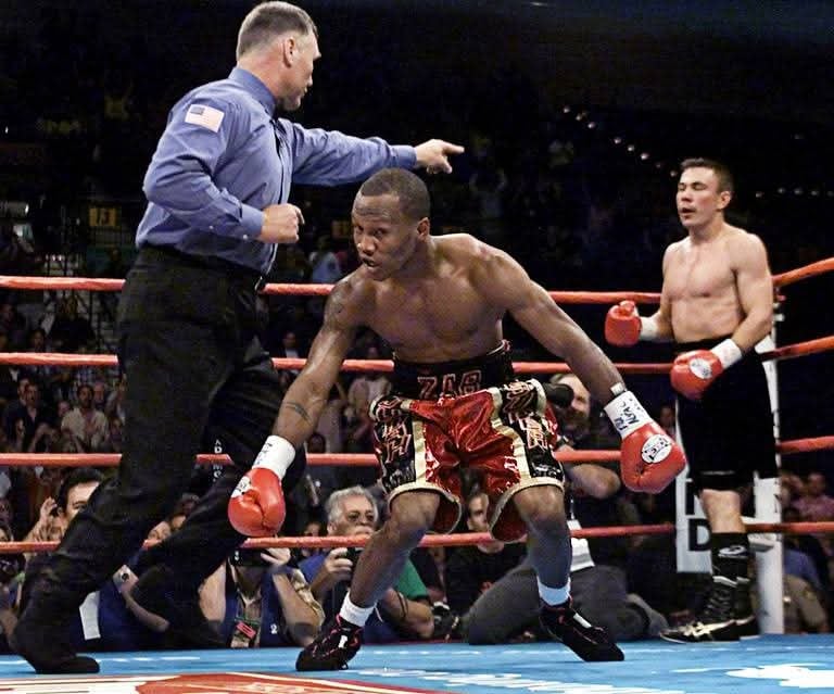 Zab Judah was a great fighter, very fast hands, he was actually winning that fight until he got caught. Tszyu hit him with a big right hand and Judah got up but his legs were gone. He stumbled, pointed at referee Nady, said something, and then collapsed. I'd still love to know what Judah said to referee Nady.