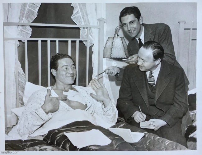 On June 13th, 1935, shortly before his infamous fight with James Braddock, Max Baer was burned over the Heart by a pistol with a blank cartridge when the pistol accidentally discharged while he was rehearsing a Vaudeville skit at Asbury Park, New York. He's shown here pointing to his wound while in the hospital answering questions from newspaper reporters about the incident.