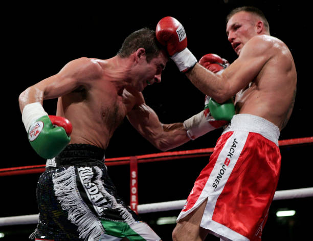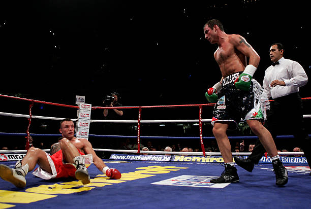 But in the first few rounds, the slim Welshman shocked the crowd by bringing the fight to the heavy-handed Pintor, aggressively pursuing and out-working him. Given his advantages in height and reach, most expected him to try and out-box the Mexican, but instead Owen initiated a fast-paced slugfest. In the fifth, the gutsy challenger cut his opponent over both eyes, though he himself sustained a nasty gash on his lip, causing him to swallow a significant amount of his own blood.