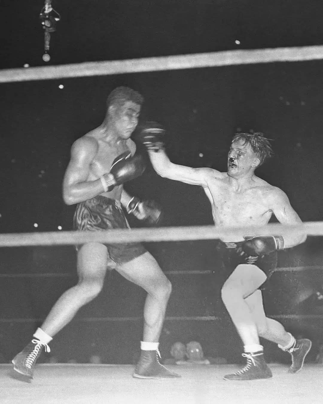 While it appears that no film footage exists of that main event featuring the two fighters, it had to have been something to watch, as the two slogged through 10 rounds of a brutal 12-round bout.
