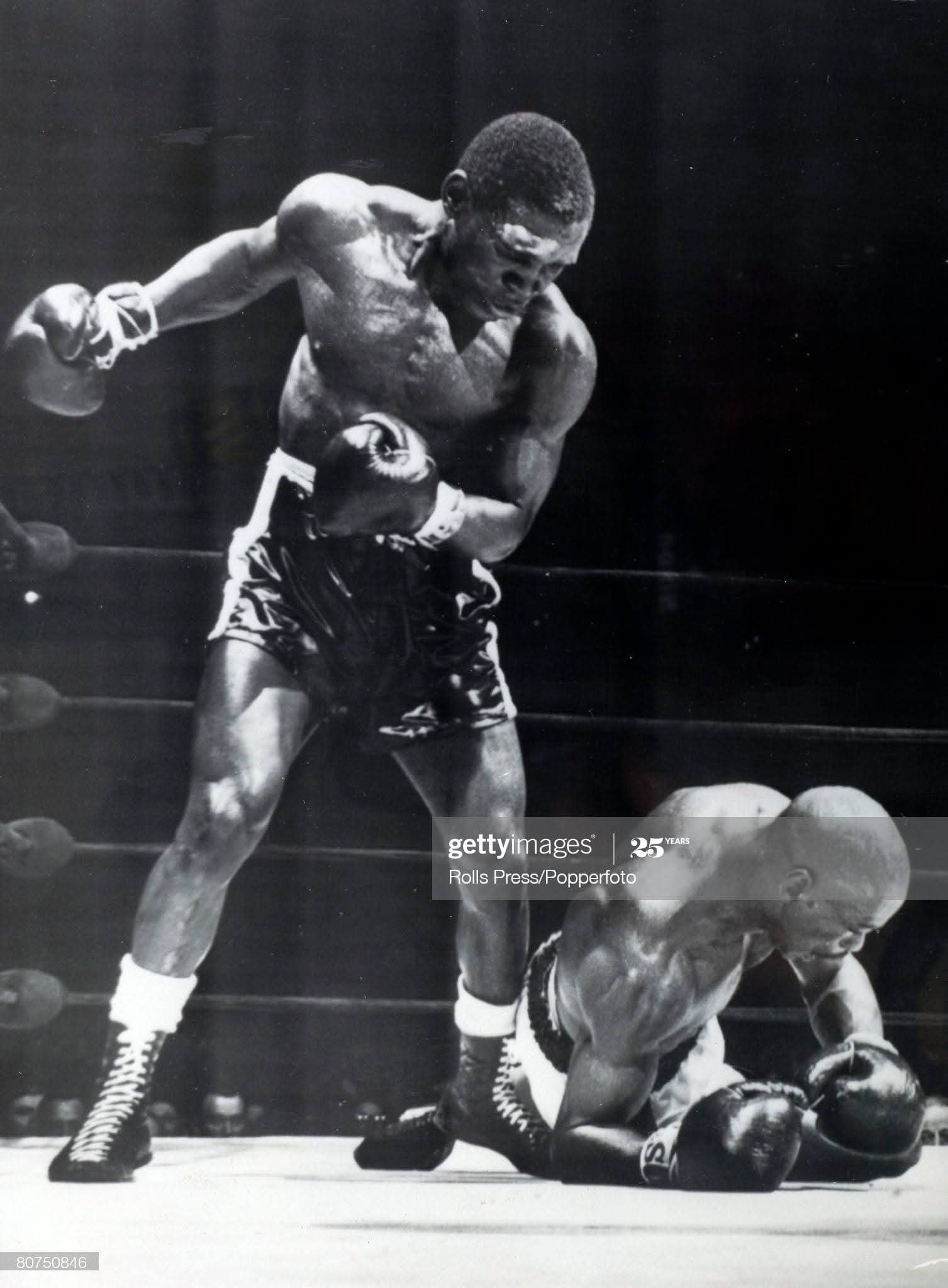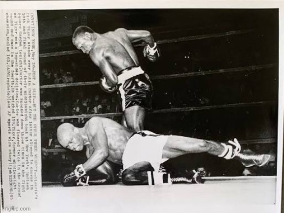 This is one of the greatest boxing photos ever taken, Dick Tiger standing over Rubin "Hurricane" Carter after flooring him at Madison Square Garden in 1965, Tiger bulldozed Carter that night. If you're not familiar with Rubin Carter, he was one of the most violent, menacing, and genuinely frightening men to ever enter a boxing ring. They called him "Hurricane" because of his ruthless, aggressive, and hard punching style. But he was no match for Dick Tiger.