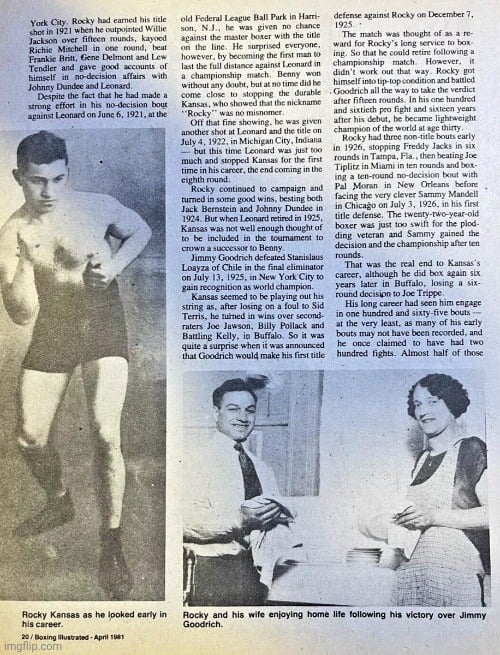 Associated Press reported a near universal feeling at ringside that he would once again fade, that he could not possibly sustain the savage pace he set at the bell; that feeling was born out. But this time, he did not wilt. Kansas split lightweight series with the likes of Johnny Dundee and Jack Bernstein but when his last best chance presented itself, he took it. The veteran threw the championship aloft at the bell. I love Rocky’s narrative. He was a lion who had the terrible luck to share a cage with a tiger who, despite all those maulings, had enough to see off the cub they tried to move on to his territory."