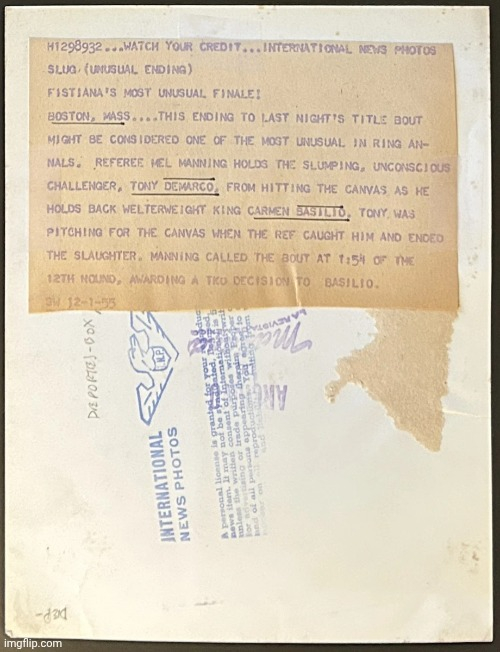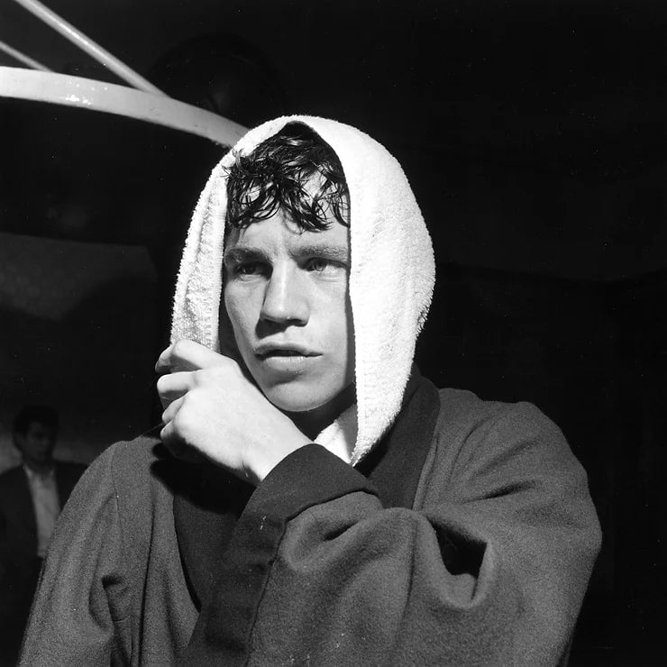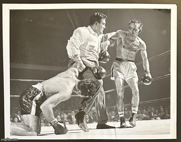 Iconic photo right here. There's different kinds of shell shock, there's the shell shock of being in a real war, which nothing can compare to. But there's also the shell shock of being in physical combat with another person inside of a ring, taking physical beatings. This is one of my favorite boxing photos ever taken, Carmen Basilio aka "The Onion Farmer" being held back by the referee after stopping Tony DeMarco aka "The Boston Bomber" in round 12 of their November 1955 rematch in Boston for the world welterweight title. Basilio and DeMarco put eachother through pure hell, and this image captures the shell shock on Basilio's face at the conclusion of two brutal wars with DeMarco. Tony DeMarco was a hard hitting, relentless man, they didn't call him "The Boston Bomber" for nothing. They took years off of each other's careers and their rivalry is one of the most epic in boxing history. In the rematch, Basilio retained the world welterweight title he won from DeMarco in their first fight which ended in almost identical fashion when Basilio TKO'D DeMarco at 1:52 in round 12. At the conclusion of their rivalry, Basilio said of DeMarco, "When he hits you, you know you've been hit. All you have to do is ignore the effects. If you think it's going to hurt, then it will." Carmen Basilio was a hard man. Make no mistake about that.