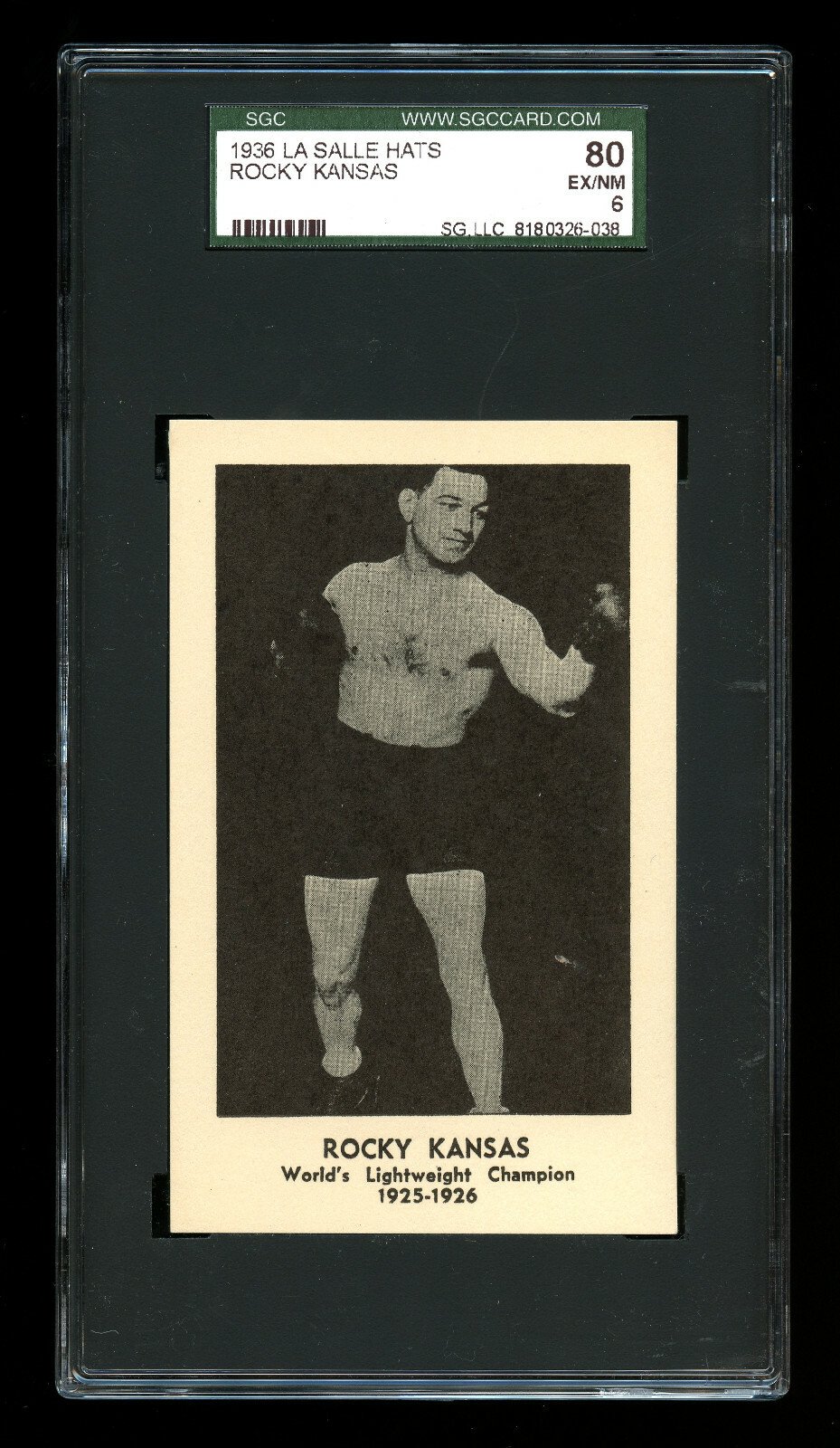 This is a 1936 LA Salle Hats card of Rocky Kansas. This rare set was issued in 1936 by the La Salle Hat Company. Based in Philadelphia, that company distributed these cards featuring eight lightweight boxers. The cards themselves are basic. The fronts feature black and white pictures of the boxers along with their name and title reign at the bottom. The set was look back of sorts, as it included cards of past lightweight champions through history. It also included a card of Lou Ambers, then the world lightweight champion. Backs of the cards are blank. An envelope was used for the cards with a short description on it. Printed on the outside, the company called this, ‘A picture collection of famous lightweight champs furnished with the compliments of La Salle Hat Company, Philadelphia.’ The exact mode of distribution for these cards, however, is unknown. It is not clear if they were simply given to anyone or if a purchase was required. One interesting note here is that the cards do not appear to have been limited to only the Philadelphia area. We know that from the envelopes which, in addition to stating the cards are with the compliments of the hat company, also add, ‘and _____________.’ The blank line represents a blank box printed on the envelopes and specific stores used that area to either stamp or print their own name. Those stores were likely distributors and the envelope was used much in the way that late 1800s trade cards were used – cards with stock images that used by a variety of businesses. As this auction indicates with an envelope stamped by an Ohio business, the cards were likely distributed outside of Philadelphia. While I have listed this set in the Miscellaneous (U-Card) section, it could also be considered a trade card issue. These cards are not easy to come by. Finding one is an achievement and finding a complete set is extremely difficult.