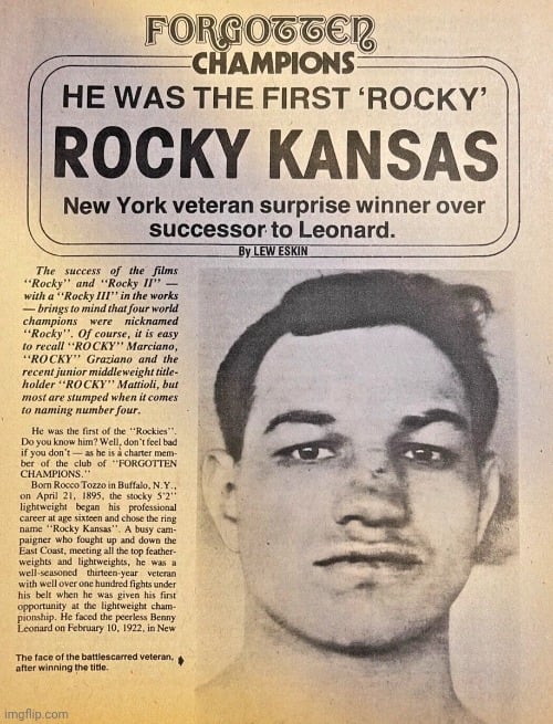 Up next, Rocky Kansas, world lightweight champion that fought from 1911 to 1932. Rocky Kansas turned professional in 1911, and his early career was marked by consistency. He lost only two official decisions in his first 75 fights—a testament to his skill and determination. Known for his tenacity and relentless fighting style, Kansas quickly became one of the most respected athletes in boxing . Honest to god, he was one of the most relentless, tenacious, and determined men to ever enter a boxing ring. Over the course of his hall of fame career, he beat Freddie Welsh, Lew Tendler, Jimmy Duffy x2, Johnny Dundee x2, Johnny Kilbane, Ritchie Mitchell x2, Jack Bernstein, Charley White, Frankie Britt, Ad Wolgast and Jimmy Goodrich. That's the resume of an all-time great. He shared the same era as the great Benny Leonard, and tried like hell, four times, to get the lightweight title away from Leonard, but Leonard was special. But like I said, Rocky Kansas was one of the most tenacious and determined men to ever enter a boxing ring and he would not be denied entry into the throne room of the lightweight gods. Born Rocco Tozzo on April 21, 1895 in Buffalo, NY. A former newsboy, he started using the name Rocky Kansas 1911 when a ring announcer mistakenly introduced him under that name. Known as “Little Hercules,” the 5’2” Kansas was a stocky, powerful brawler with a sturdy build. One of the top lightweights of his era, he met Benny Leonard four times between 1916-1922 (ND 10, ND 12, L 15, KO by 8). Following Leonard’s retirement as champion in 1925, Buffalo’s Jimmy Goodrich ascended to the title. In front of 12,000 fans at Buffalo’s Broadway Auditorium on December 7, 1925, Kansas, in his 160th bout and 15 years into his career, defeated Goodrich to become new champion. His reign was brief, dropping the strap to Sammy Mandell in 1926. He promptly retired, but engaged in one comeback fight in 1932 (L 6) before retiring for good.