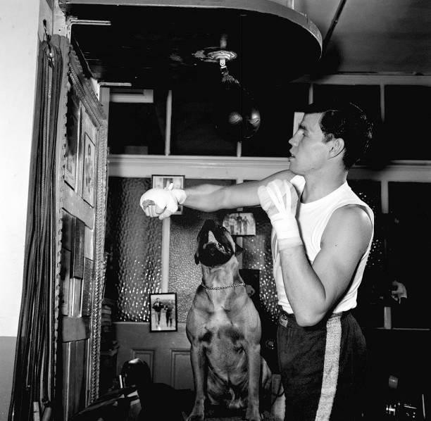 Great boxing photo, Terry Downes hitting the speed bag with his dog Champ by his side watching.
