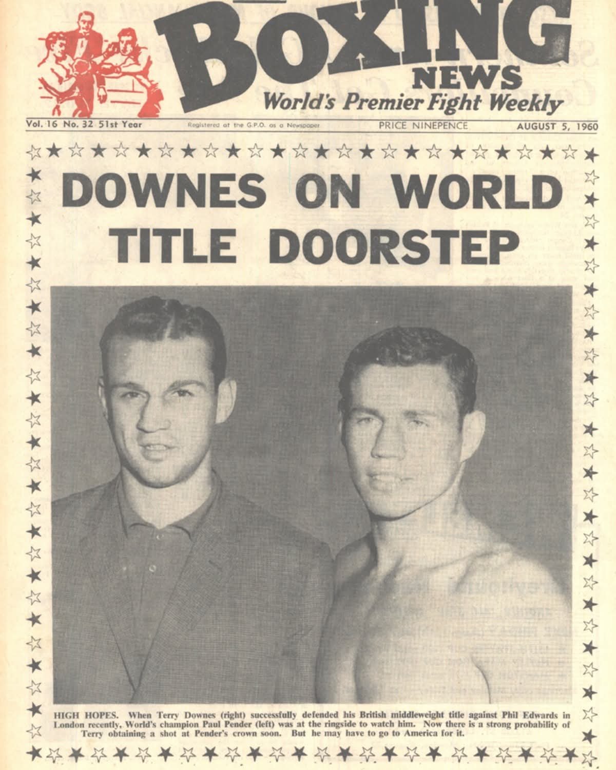 Only 17 months on from his debut, on 30 September 1958, Downes was back at the Harringay Arena, but this time against an opponent with an impressive 46-3-3 record. Welshman Phil Edwards had held the Welsh Area middleweight title and despite putting up a gutsy performance, was simply worn down by the audacious Londoner in the 13th round.