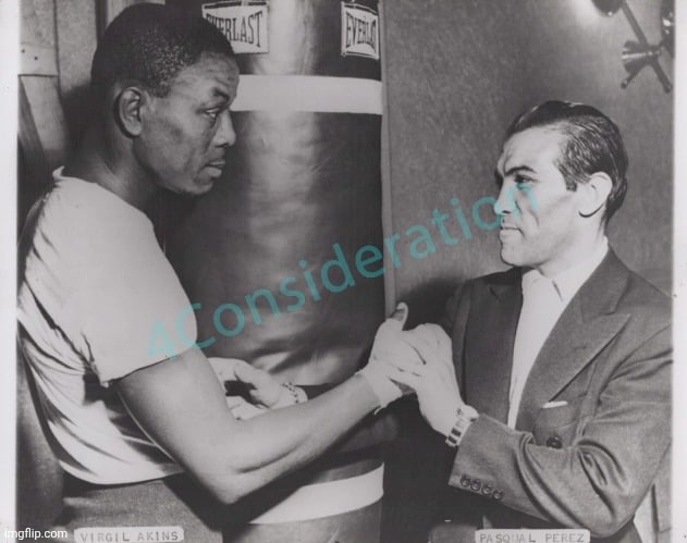 Virgil Akins vs Vince Martinez. If you're not familiar with Vince Martinez, he was one tough and clever SOB with an iron chin, going into this fight with Akins, Martinez had a record of 60-5, and had never been knocked down in a fight. This was a one-sided affair, with Akins on the attack from the opening bell, sending Martinez to the canvas seven times before the slaughter was finally stopped and the referee intervened in round four to declare Akins the new world welterweight champion by a TKO.