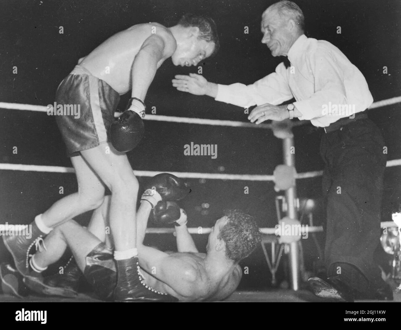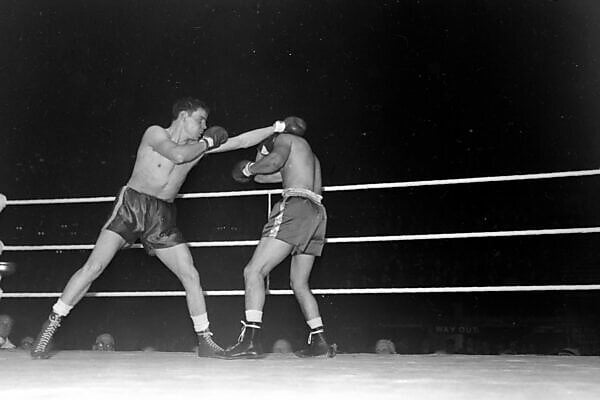 Terry Downes and Paul Pender during their July 1961 middleweight title fight, the top photo shows Terry Downes driving Paul Pender into the ropes with a jab, the bottom photo shows Terry Downes standing over Paul Pender after knocking him down.