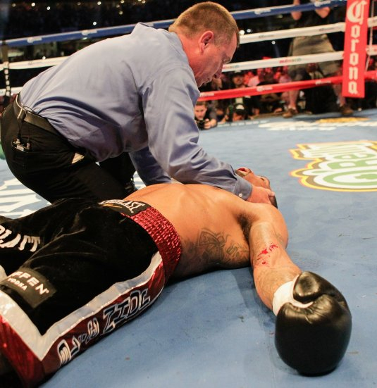 The injury was significant enough for referee, Tony Orlando call an end to the contest midway through the 8th round and Holyfield was awarded the win by split technical decision.