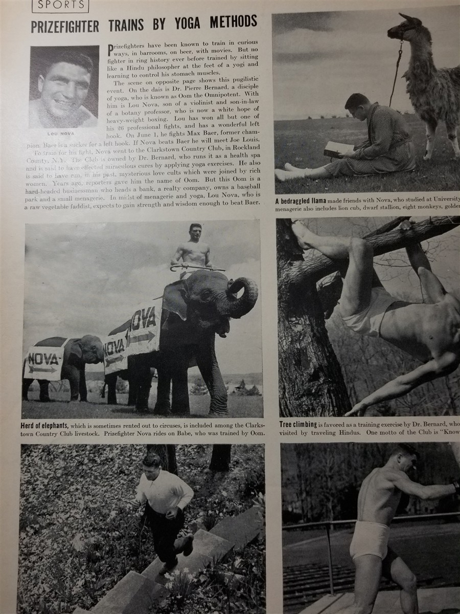 In the lead-up to Lou Nova's 1939 fight against former heavyweight champion Max Baer, Nova got in contact with Oom, who called himself, "the reincarnation of the Supreme Being, Oom, the Omnipotent." Nova was taught several actual yoga poses and techniques that seemed to help his overall condition, and he benefited from Oom's private zoo, like riding Oom's elephants and having toucans and leopards around for photographers during fight promotions.