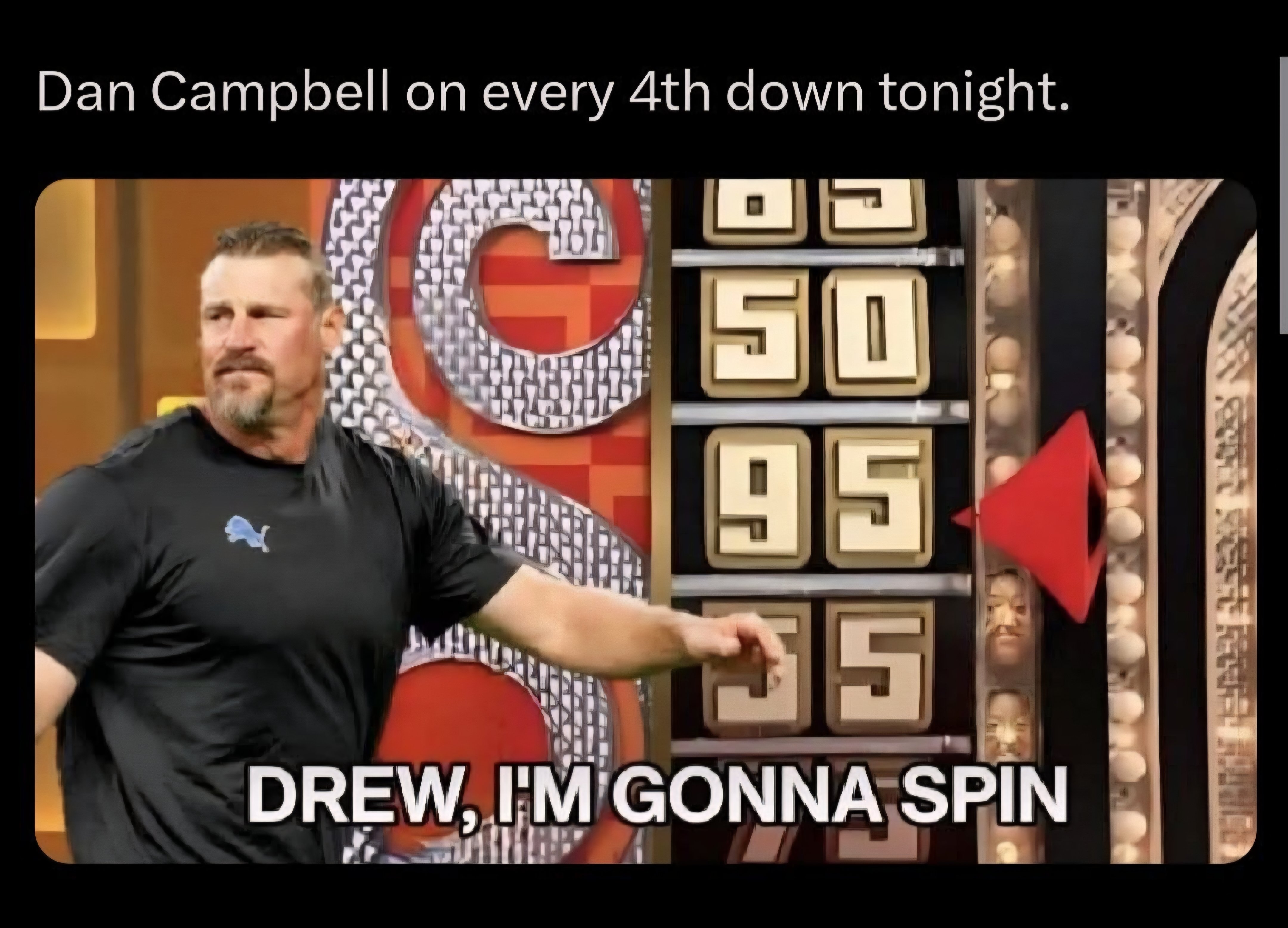 It has begun! The luck turned and the fans turned! We don't want "working-class-trust-your-gut-cause-the-numbers-are-for-mcdaniels-go-on-4th" Dan Campbell! Now we need "physics-degree-follow-the-analytics-and-stick-to-the-book" Dan Campbell!