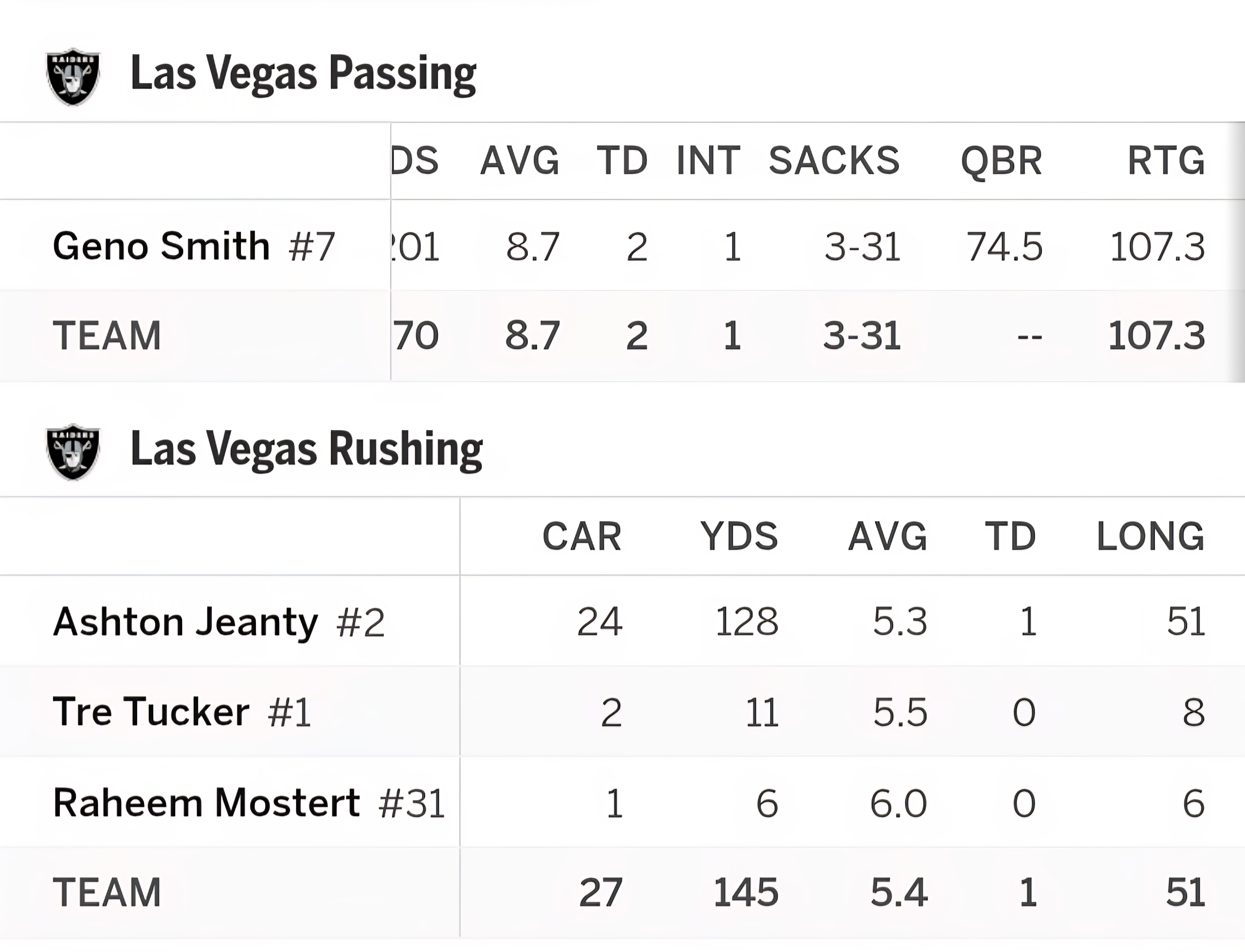 check out this box score. how many times this season did Geno put up a very respectable QBR & passer rating? very few, i submit. he's not worth a sack of squash as a quarterback. and look at Jeanty. the #6 overall pick couldn't eclipse 1,000 yards in a 17-game season, yet in this game he went for a buck 28 @ 5.3 per tote and had two 50+ yard house calls.