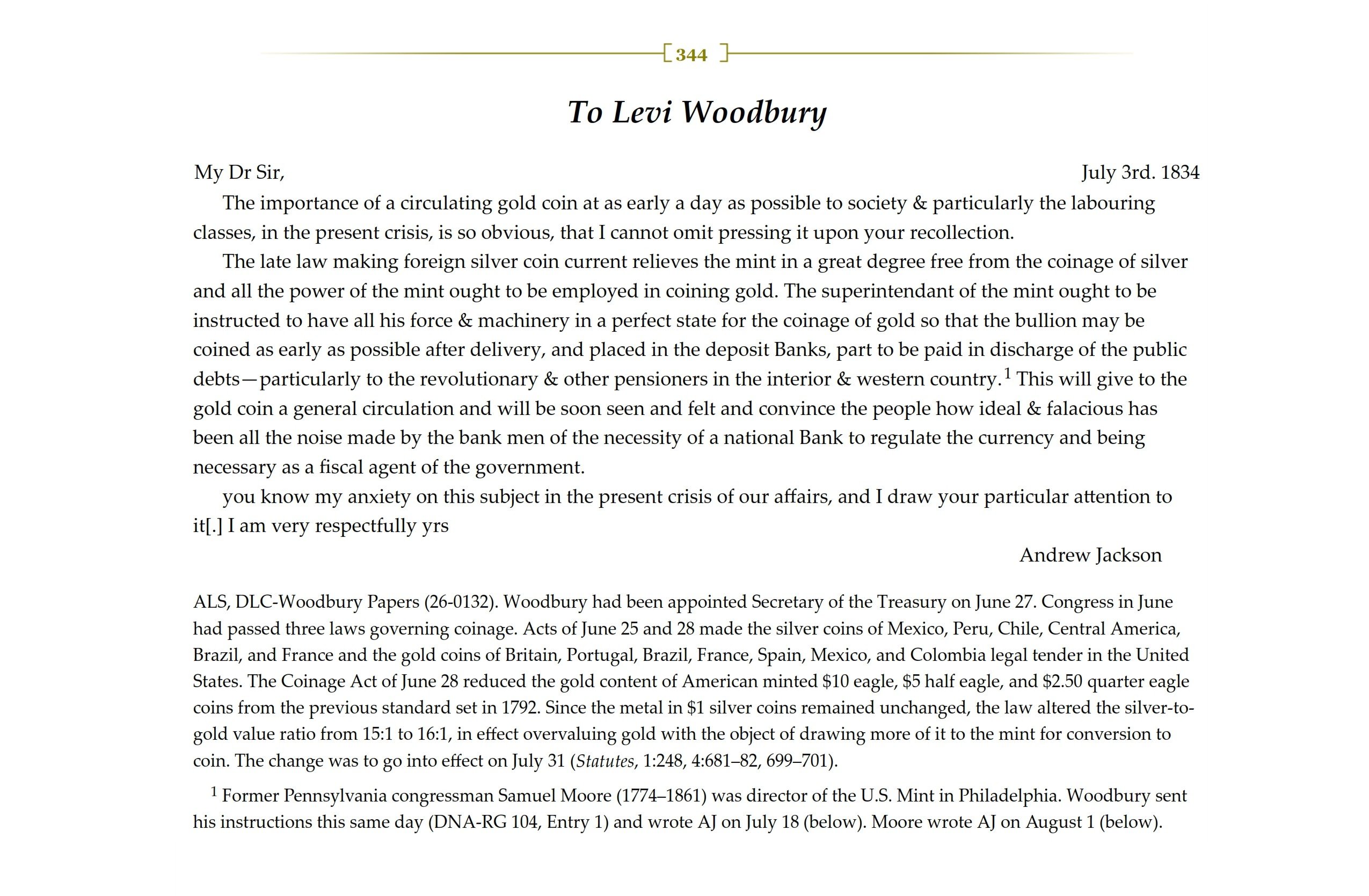 2) Jackson’s push for coinage---See, his below letter to Woodbury of July 3, 1834; and,