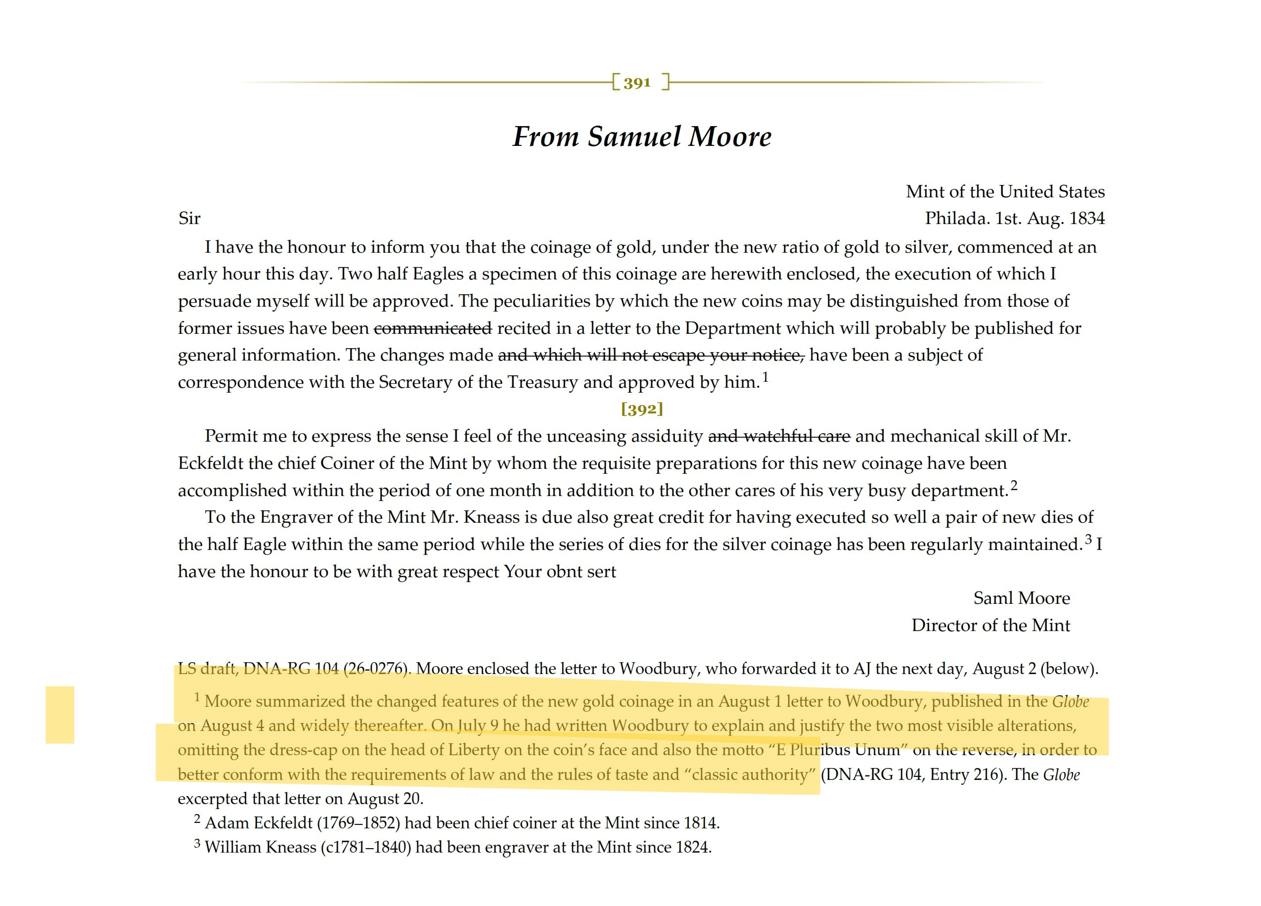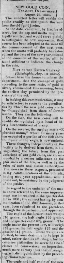 3) According to Moore in his August 2nd letter to Jackson (through Woodbury), the omission of the “cap on the head of Liberty on the coin’s face and also the motto “E Pluribus Unum” on the reverse, [was done] in order to better conform with the requirements of law and the rules of taste and “classic authority.”