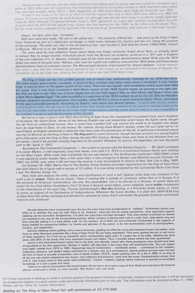 The King of Siam set has two unfilled spaces, one of which was, undoubtedly, intended for the 1834 Half Dime. The other empty space poses a problem. In point of fact, scholars may never know what it contained. It may forever linger a missing piece to the jigsaw puzzle of our story. There are two equally valid candidates which could have filled the space. One, it may have contained a With Motto variety of the 1834 Quarter Eagle; its opening is the right size. But then we have to ask: Why two Quarter Eagles but not two Half Eagles? Why no With Motto Half Eagle if there was a With Motto Quarter Eagle ? The other possibility is a specimen of the 1833 medalet struck by the U.S. Mint for President Andrew Jackson's second inauguration; this medalet, Julian PR-33, is struck in gold, measures about 19mm., and would fit the space provided perfectly. According to Stack's, who favors this second opinion: "It would also occupy a nearly central position within the top row of the pieces in the case, would present a portrait of our country s elected leader at the time the set was made, and would do so in the 'royal' metal without claiming royalty (since it was of a size comparable to the smallest circulating gold denomination of the period)".