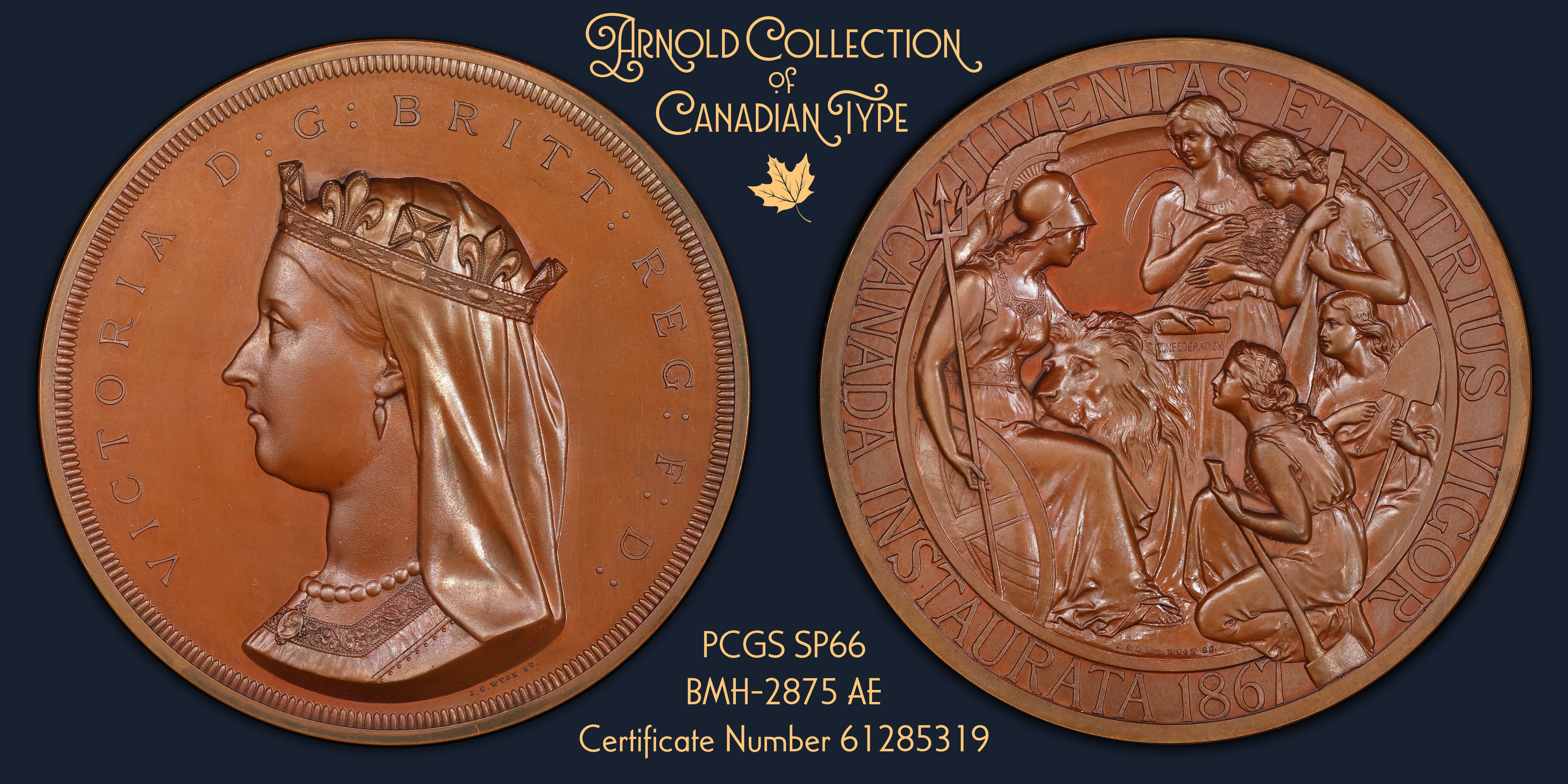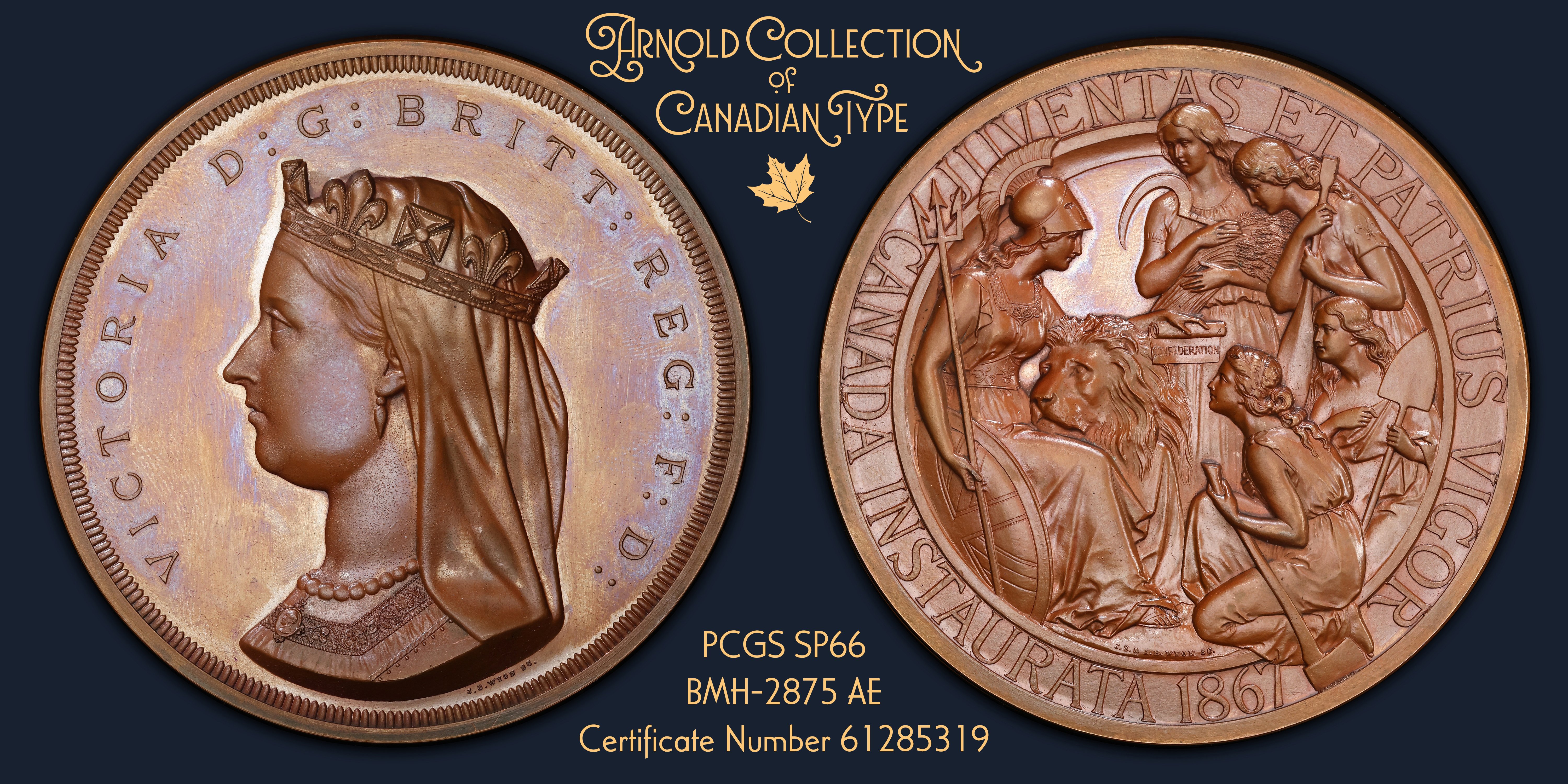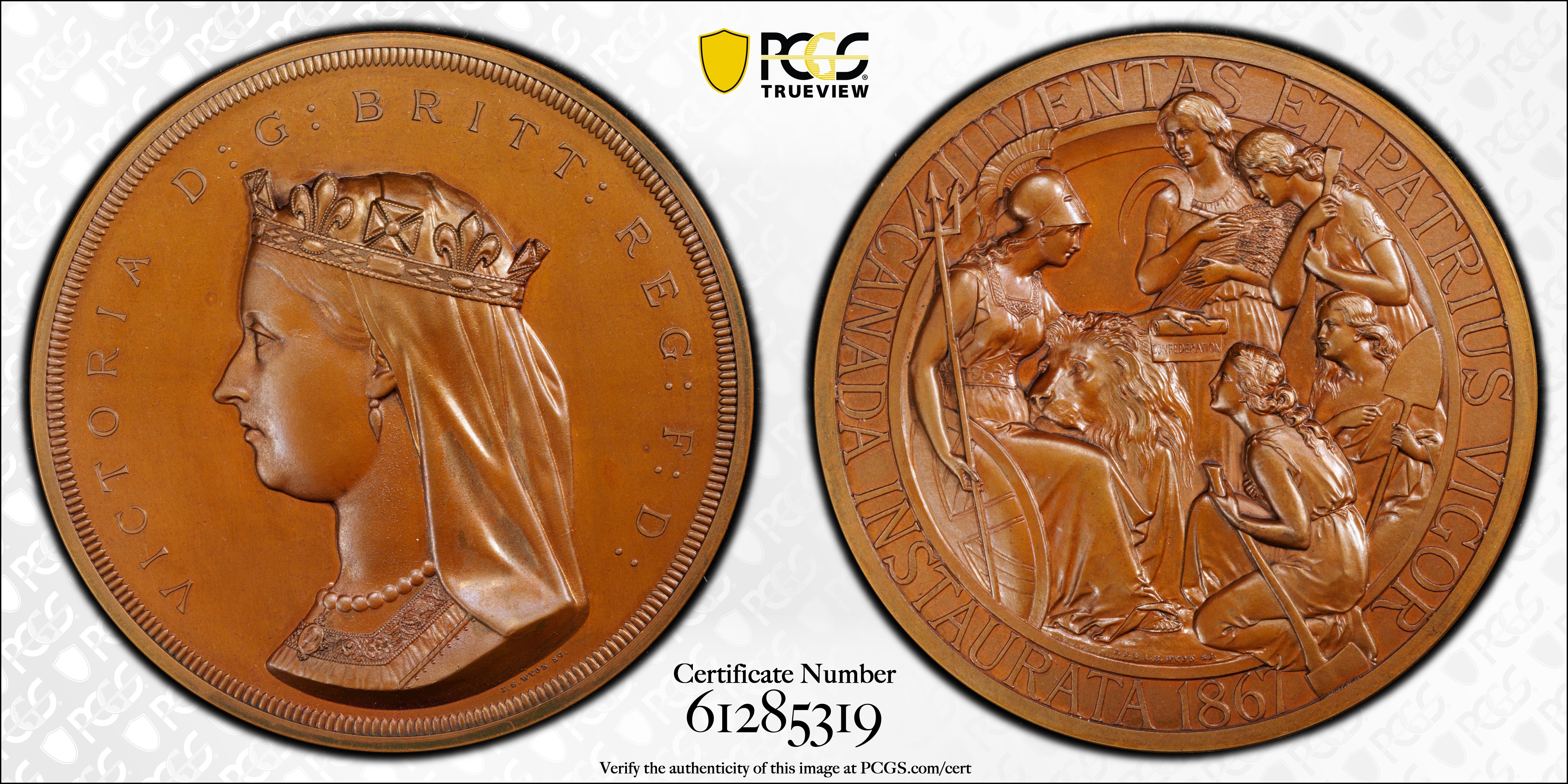 The medal, prepared by J.S. and A.B. Wyon, depicts Britannia, lion purring in her lap, handing off a scroll with the word CONFEDERATION inscribed. She hands it to four allegorical depictions of the first four provinces. Ontario, with her sickle, representing agriculture. Quebec, with fleur-de-lys on her shoulder, holds a paddle. The fur trade was Canada’s first industry, thus this allegory represents commerce. Nova Scotia holds her shovel for her mineral wealth. New Brunswick holds her axe representing her timber industry. The Reverse has the inscription “JUVENTAS ET PATRIUS VIGOR/ CANADA INSTAURATA 1867” meaning ‘Youth and patriotic strength/ Canada inaugurated 1867.’