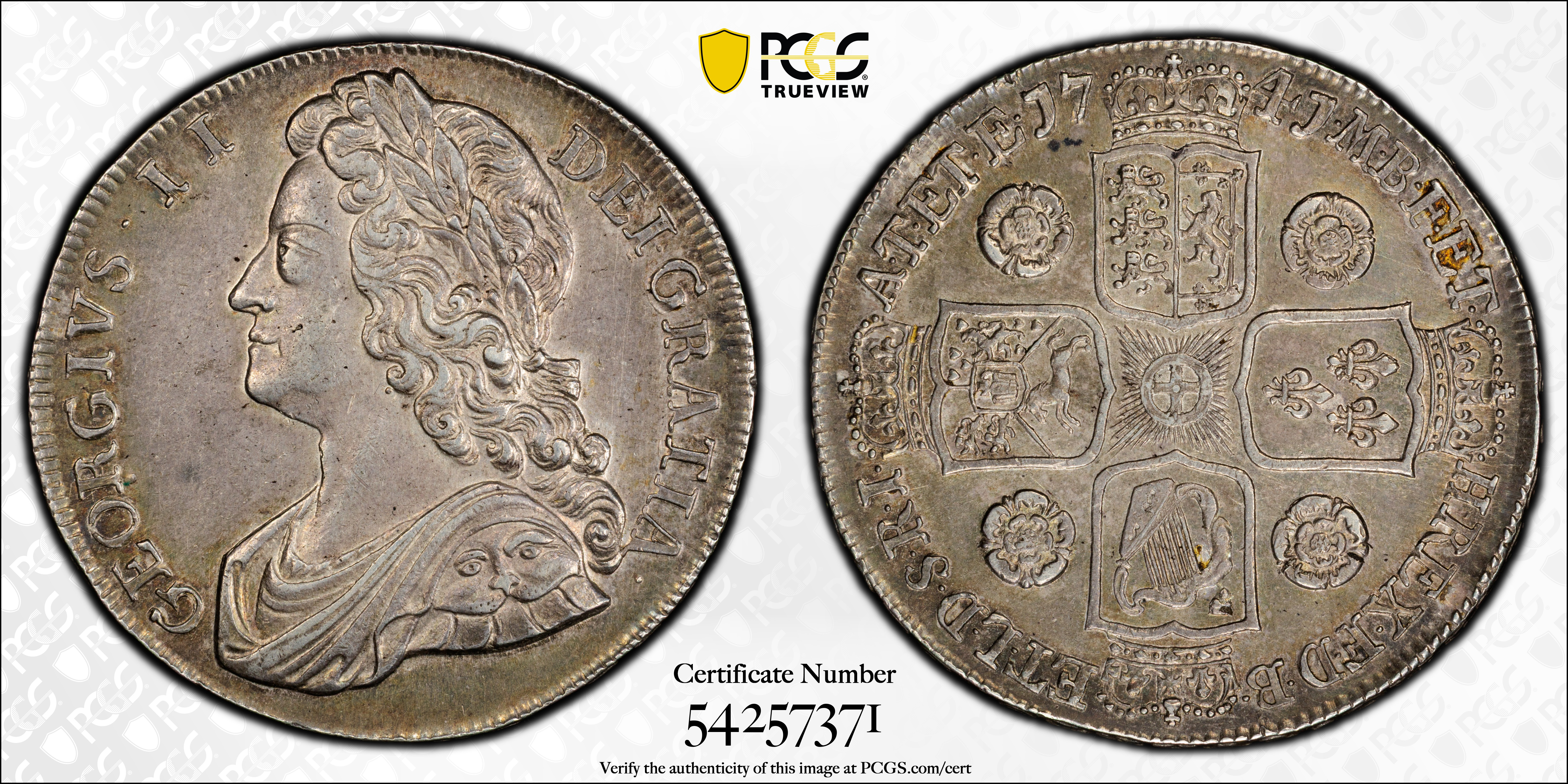 The 1741, in my view is the second most available George II young head crown of the series. This one is reasonably attractive for the date and series. There are struck in a high relief which can complicate grading. The high points are on the portrait often are not fully struck and attention to the fields is vital in terms of determining wear in contrast to a weak struck. I am pleased with the result.