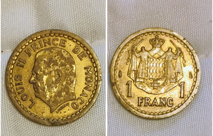 This is compounded by the picture of the second coin, which apparently is an undated coin struck in 1943 during the Nazi occupant of Monaco; this coin is definitely made of aluminium bronze, which is indeed yellow in colour. This coin will be worth a dollar or so in that condition.