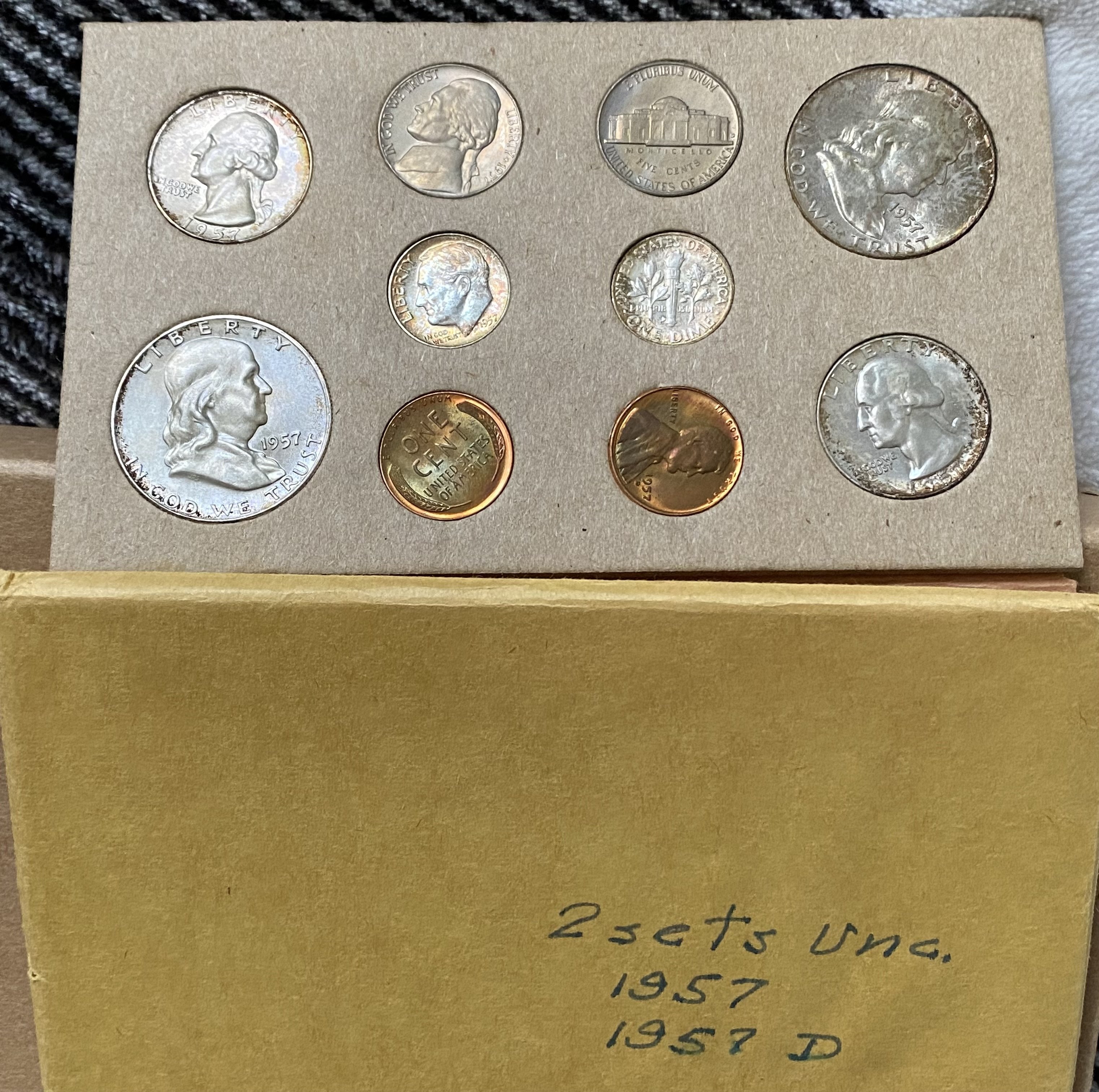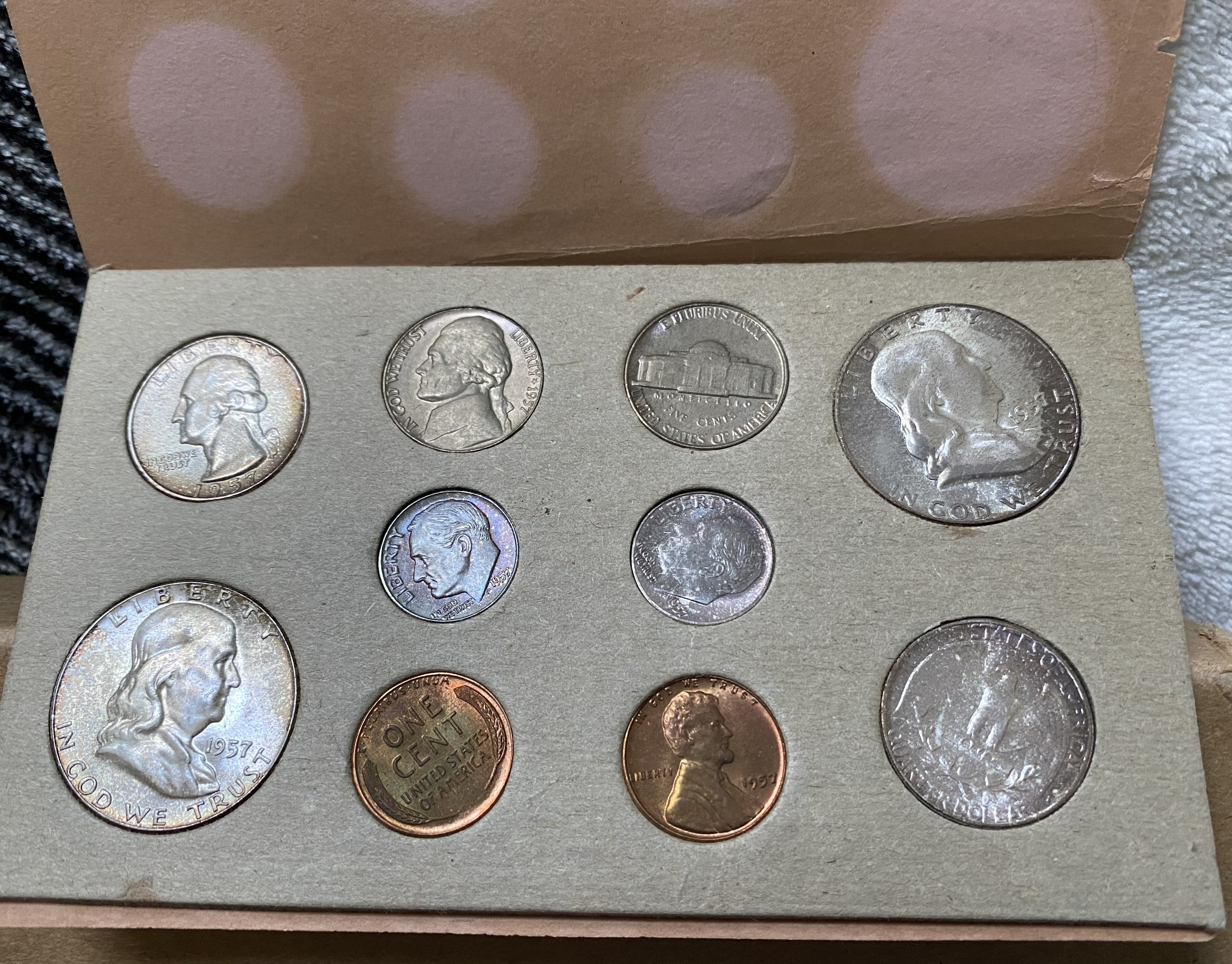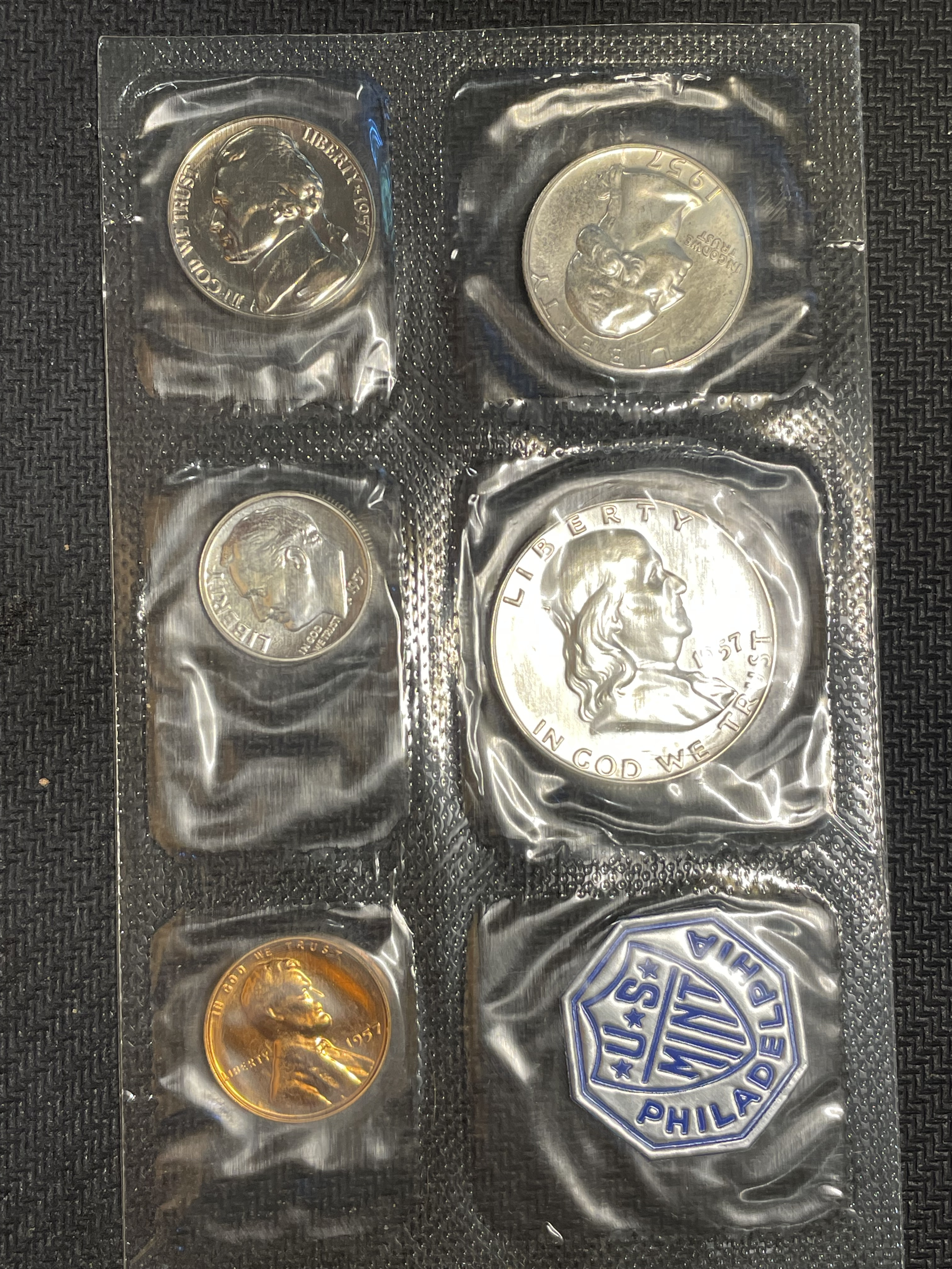 Positively a 1957 proof set. The original mint uncirculated sets came in cardboard sleeves and with double numbers of coins. Here is an original 1957 United States Mint uncirculated set.