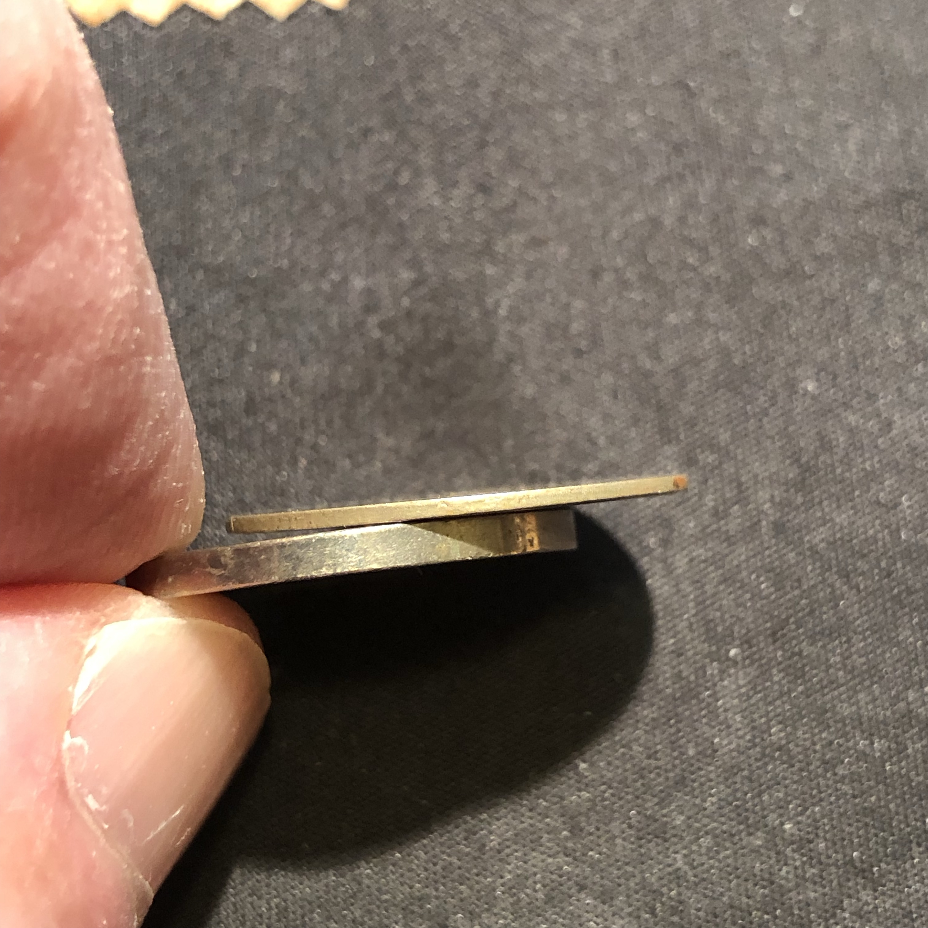 I never thought about a shaved down circulating coin. It's just slightly larger than a US Nickel. Perhaps it could be a foreign coin, in this scenario. It is indeed much thinner as shown in the photos. I only suspected it might be silver due to the color and it's familiar chink, which may be due to it's thinness.