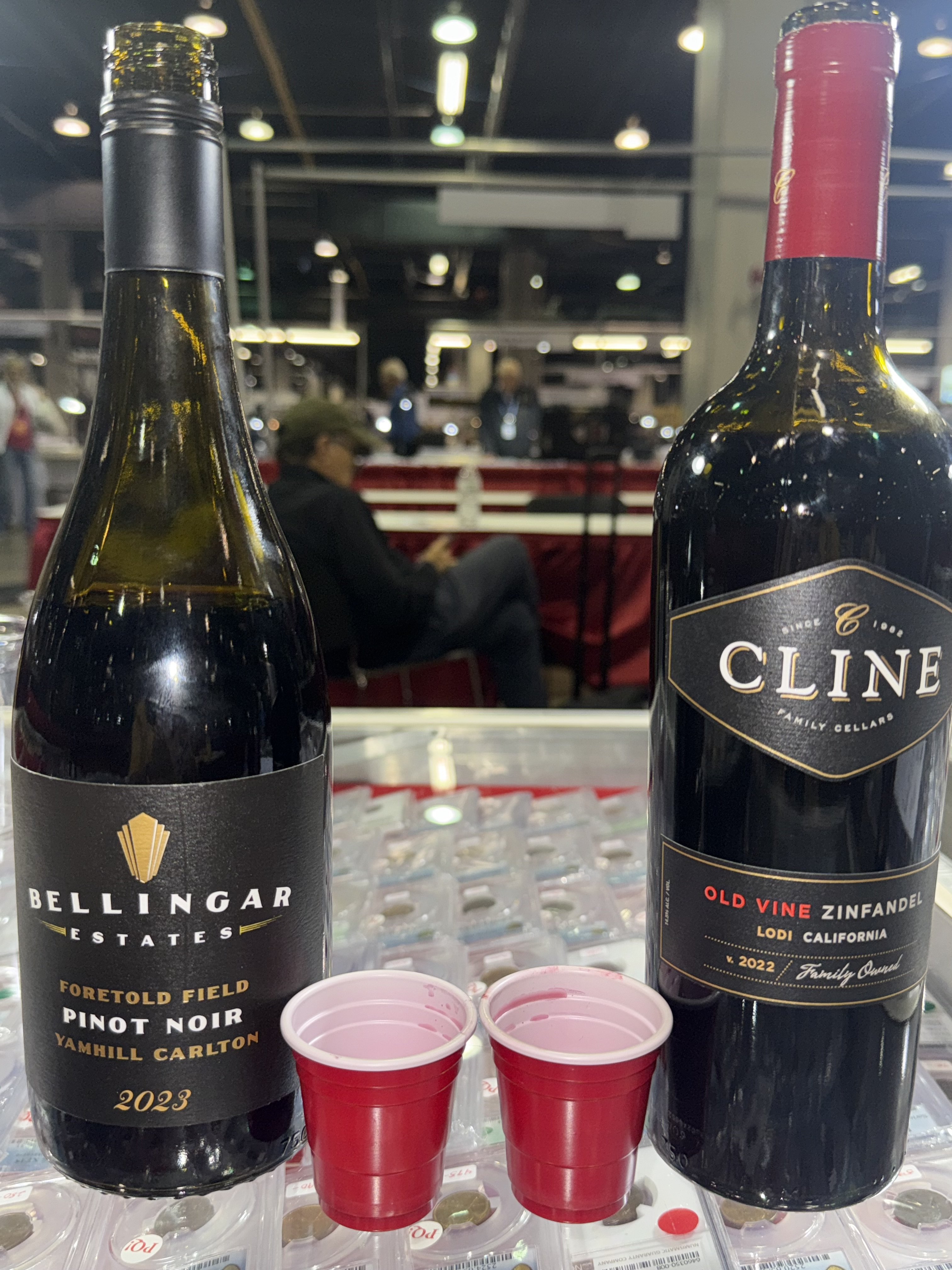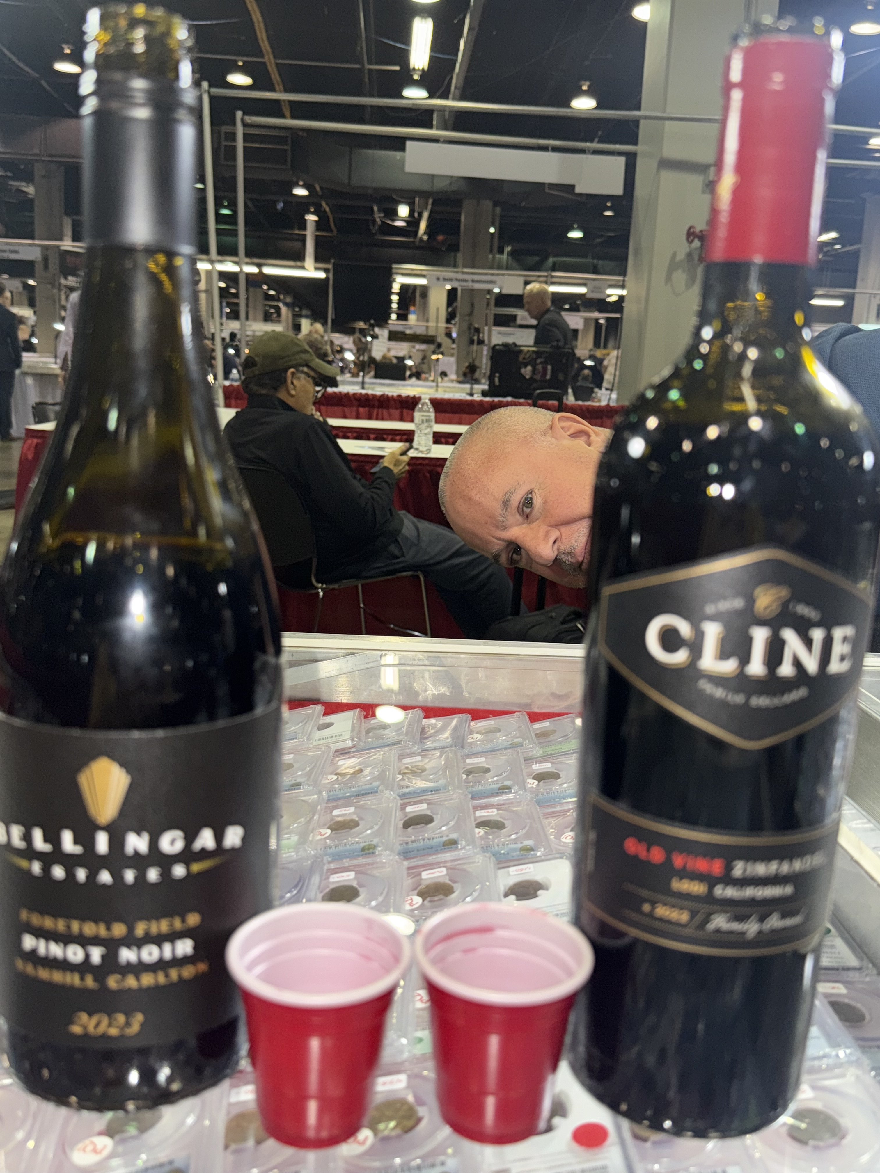 That afternoon I finished off the Rombauer Zinfandel with some help from a few other folks! Along with the rest of the Rombauer, a friend gave me this Cline Zinfandel, and Mike "Noodle" also brought me this nice Oregon Bellingar Pinot. That's Brian from Northeast Numismatics photobombing my wine bottle shot!