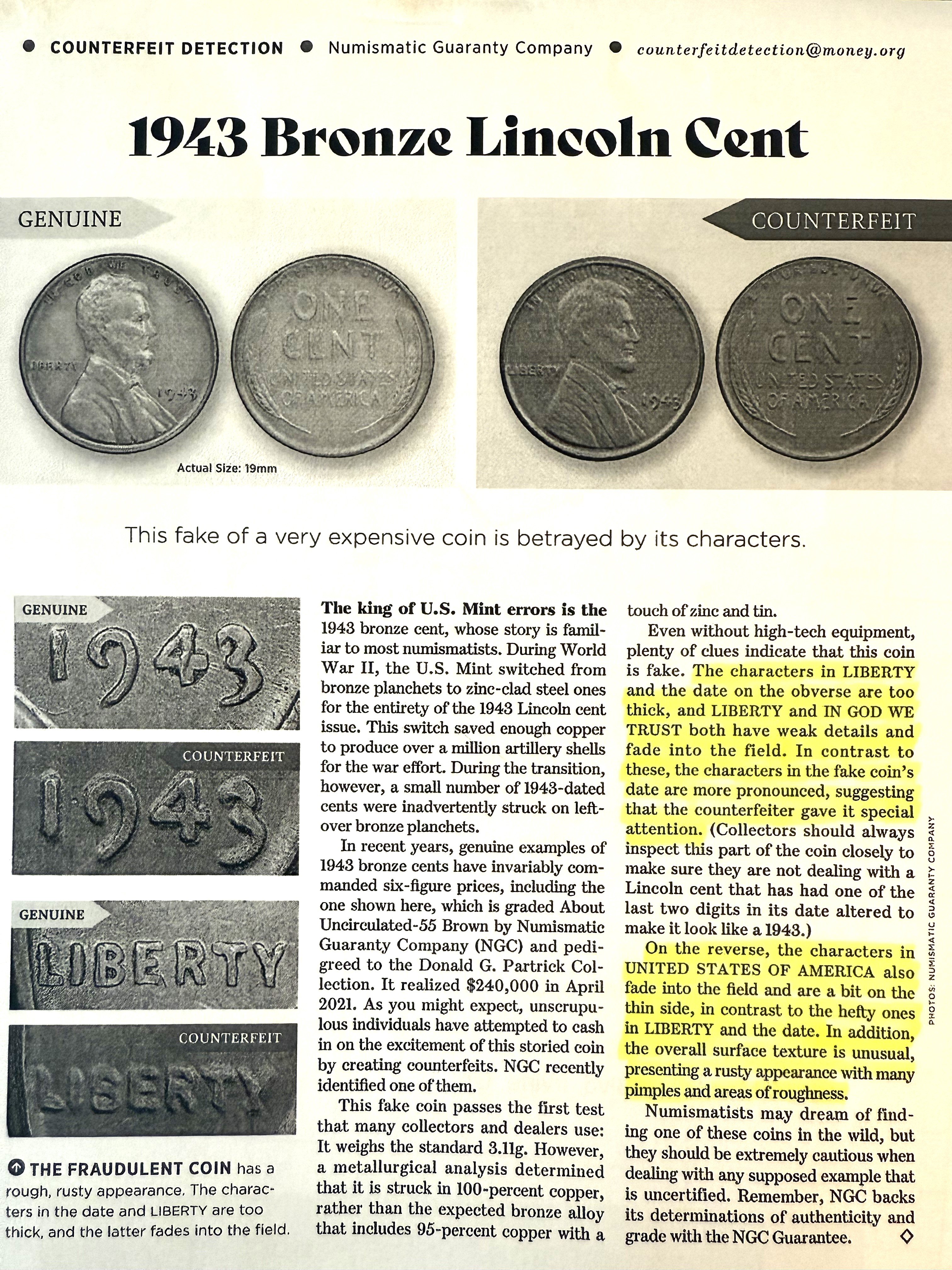 I know it's hard for these folks who have a lot of hope of owning a very rare coin like this could have been, only to have their hopes dashed, but it's also frustrating when they ask for our opinion and we give it, but our telling them we don't believe their coin is authentic makes them angry or upset or argumentative and they think we don't know what we're doing. I remind them that THEY asked for MY OPINION, and that's what I gave them and they are free to take it or leave it. So this time when I got home, I pulled out this article that I had in my counterfeit file and decided to make copies and carry them with me to shows in the hopes that it may help these people who find that rare "1943 copper" to see some of the diagnostics for themselves and possibly educate them in determining if their coin is counterfeit or authentic.