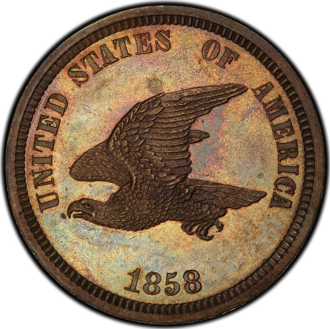 PCGS PR64+. J-206; Pollock-242. R-5. Copper Nickel, plain edge. Reverse is the same design used on the 1858 FE’s. Small eagle obverse design by Anthony Paquet is somewhat unpopular to collectors. Still, demand is great as this coin is needed for the 12 piece short set. Fully original example exhibiting mottled reddish-olive, blue-gray & pale apricot highlights against a base of warmer tan-orange patina. All but blemish free, this sharply impressed vivid piece is at the threshold of full gem quality. (Description partially paraphrased from SB).