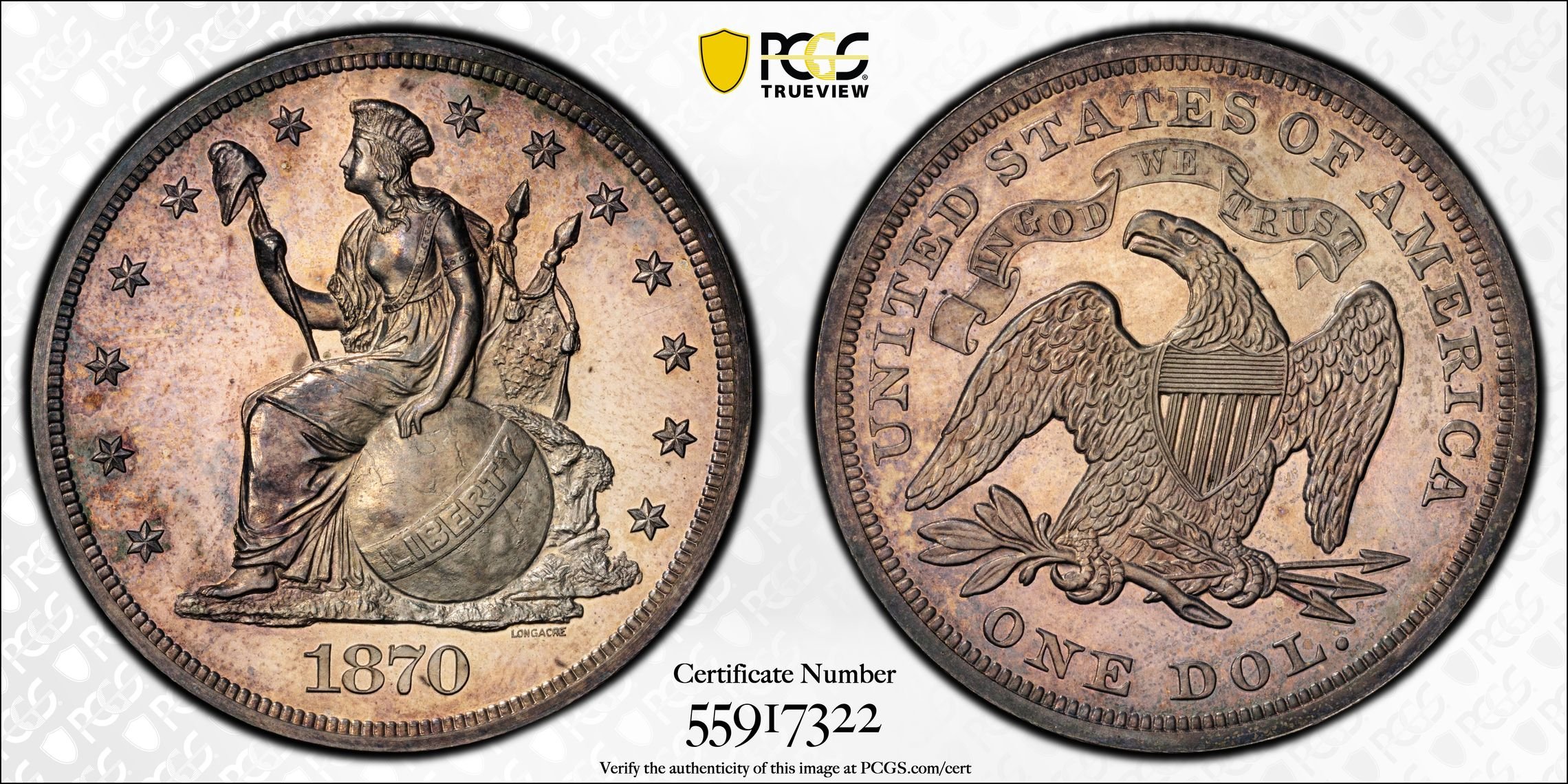 Longacre Seated Princess Dollar, 1870, R-7, PCGS 65 proof, population 3 with one higher. From a Kagin auction sale circa 1974.