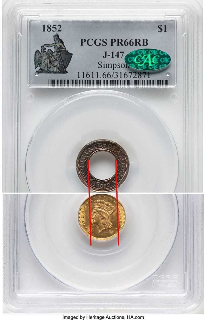 I borrowed a couple of photos from the Heritage site and presuming the PCGS slabs are all the same width ...one could see the Gold dollar is indeed wider than the hole. A type 1 might have a better chance but is still wider than the inner ring of the J147.