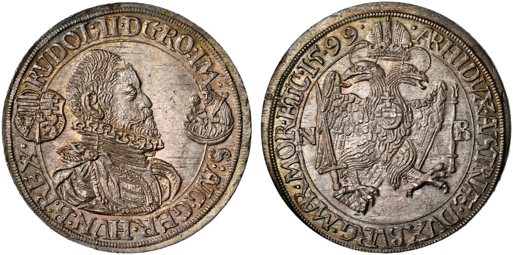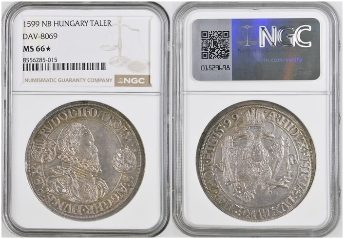 1599-NB Holy Roman Empire, Kingdom of Hungary, Rudolph II (1576-1608) Taler. Nagybánya (Baia Mare) Mint. DAV-8069. KM-MB297, Husz-1038, Voglh-102 V. Obv: Bust right, wearing ruff; coat-of-arms to left, Madonna holding infant Christ in clouds to right. Rev: Crowned double-headed eagle facing slightly right, wings spread, globus cruciger on breast; sword to left, scepter to right; N B flanking. Spectacular coin! NGC MS-66*.