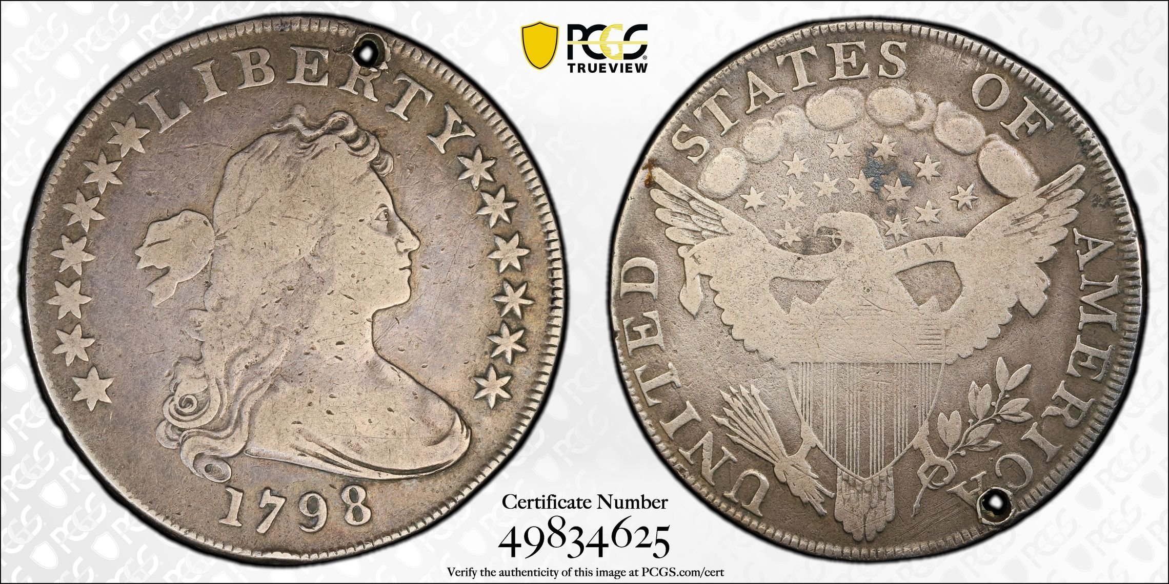 It might not look like much, but this 1798 BB-102 bust dollar is singularly rare. It is the lone example of the prime Die State I. The obverse, also paired for BB-103 and BB-107, otherwise always comes with a small football break above the date. The absence of that confirms that the BB-102 was the first pairing of that obverse die. The BB-102 usually also comes with a characteristic cud at the bottom of the reverse, often mistaken as post-mint damage upon a cursory glance. AFAIK, there is not another example extant of this rare initial die state. The reverse die was inherited from the knob 9 BB-95 and is easily confirmed by the late state (for BB-95) die crack through the I of AMERICA. The three pairings of this obverse are quickly discriminated by the alignment of the last stars on the reverse: last star up out of alignment for BB-107, aligned for BB-102, and down out of alignment for the ultrarare in all grades BB-103.