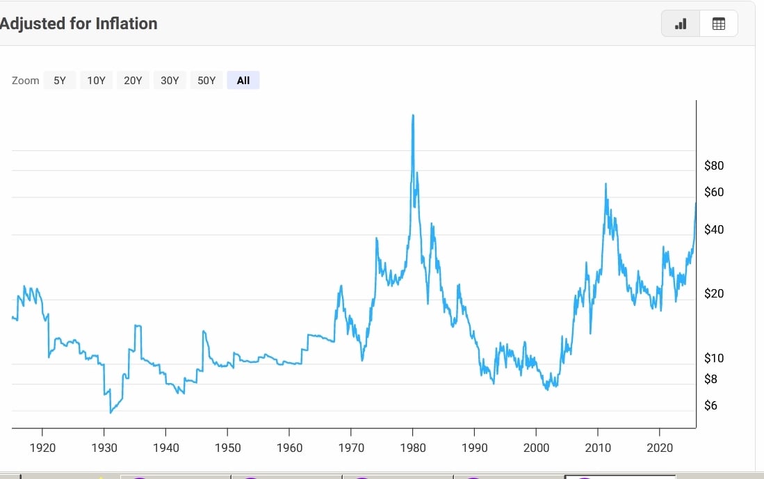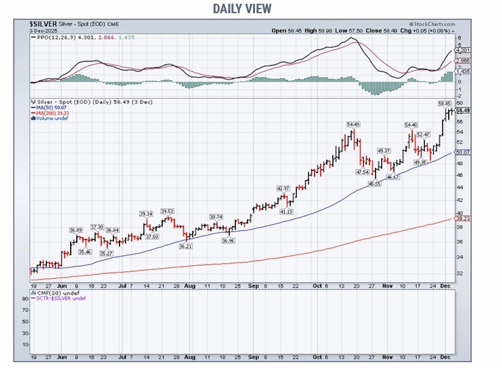 The latest silver chart shows the nosebleed may be over, and we are back in an uptrend above the 50 day moving average.