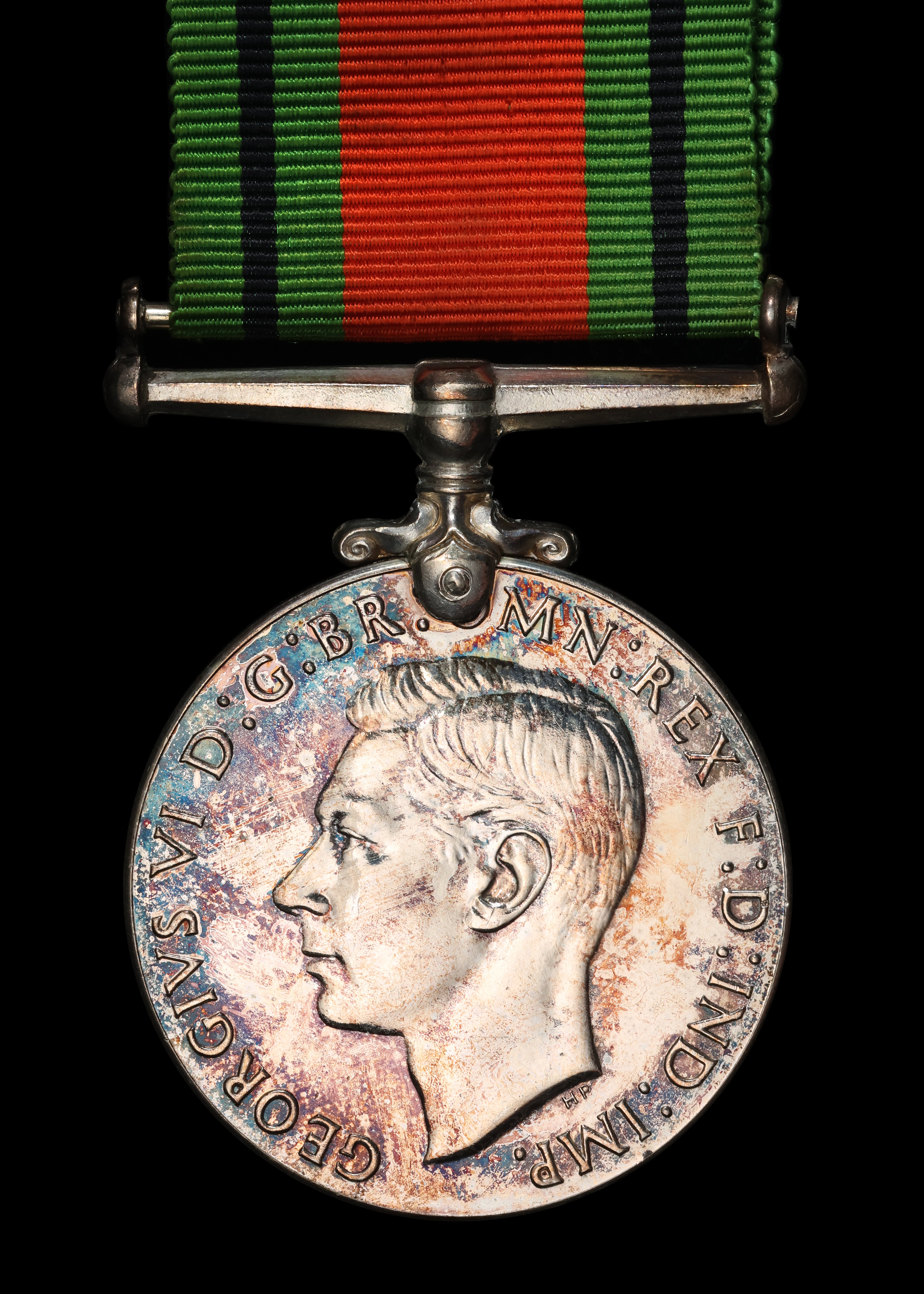 The awards are The France and Germany Star (a uniface medal), the Defence Medal, the War Medal 1939-1945, and the Canadian Voluntary Service Medal. The CVSM was engraved by Royal Canadian Mint master engraver Thomas Shingles. Shown in the order they were to be adorned from left to right.